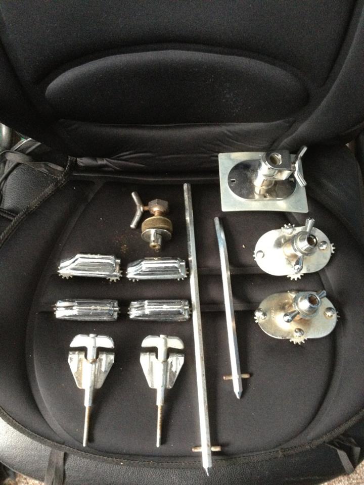 This stuff needs to be cleaned. The lugs dont look very good on top. They would be a great bottom four of a kick. The short spur is bent a little. The collet for the spurs are pretty decent. One has a rust spot right where it says ROGERS. The tom mount peice is very clean. The couple T's and claws have some rust and some pitting.