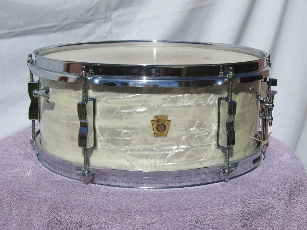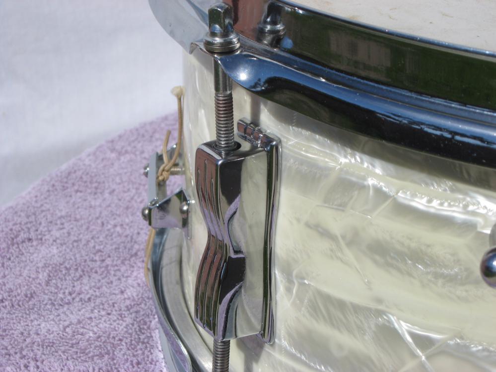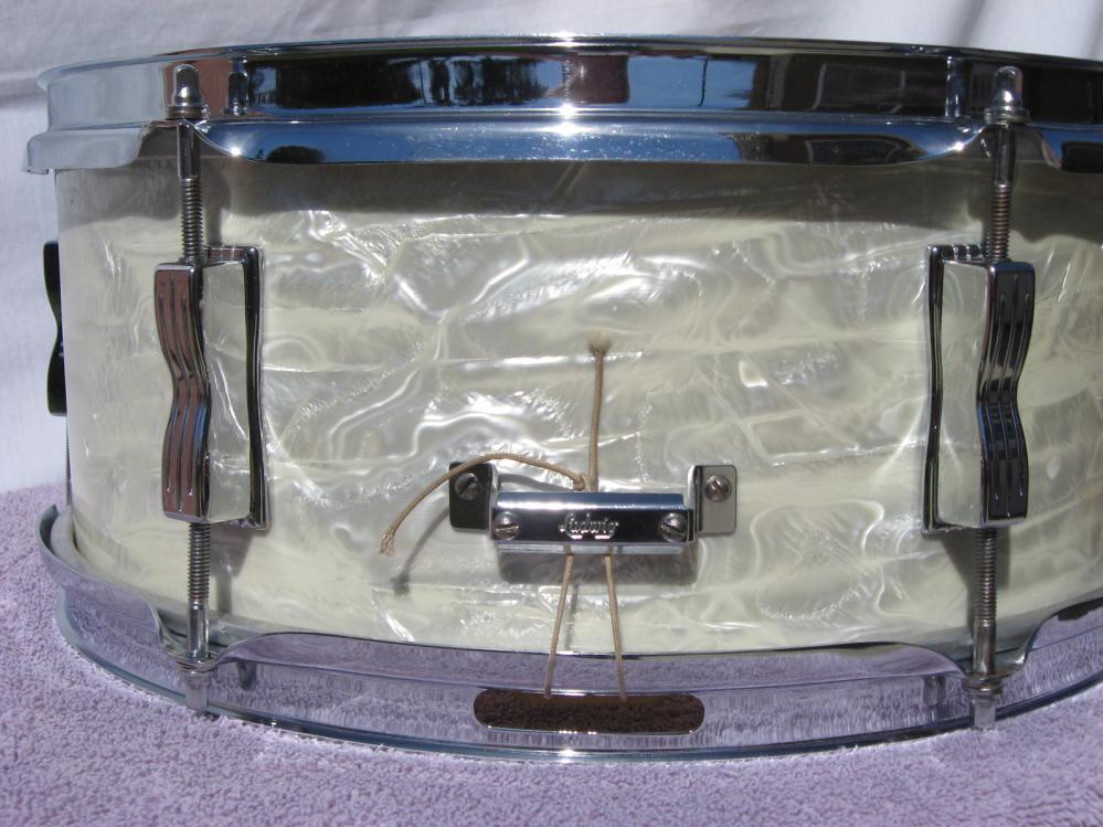 First up is my beautiful 1966 Ludwig Pioneer snare drum, 5.5 x 14 (yes, it measures an actual 5.5" deep!), wrapped in White Marine Pearl. Keystone badge with serial number 340360. Black-ink date stamped SEP 16 1966