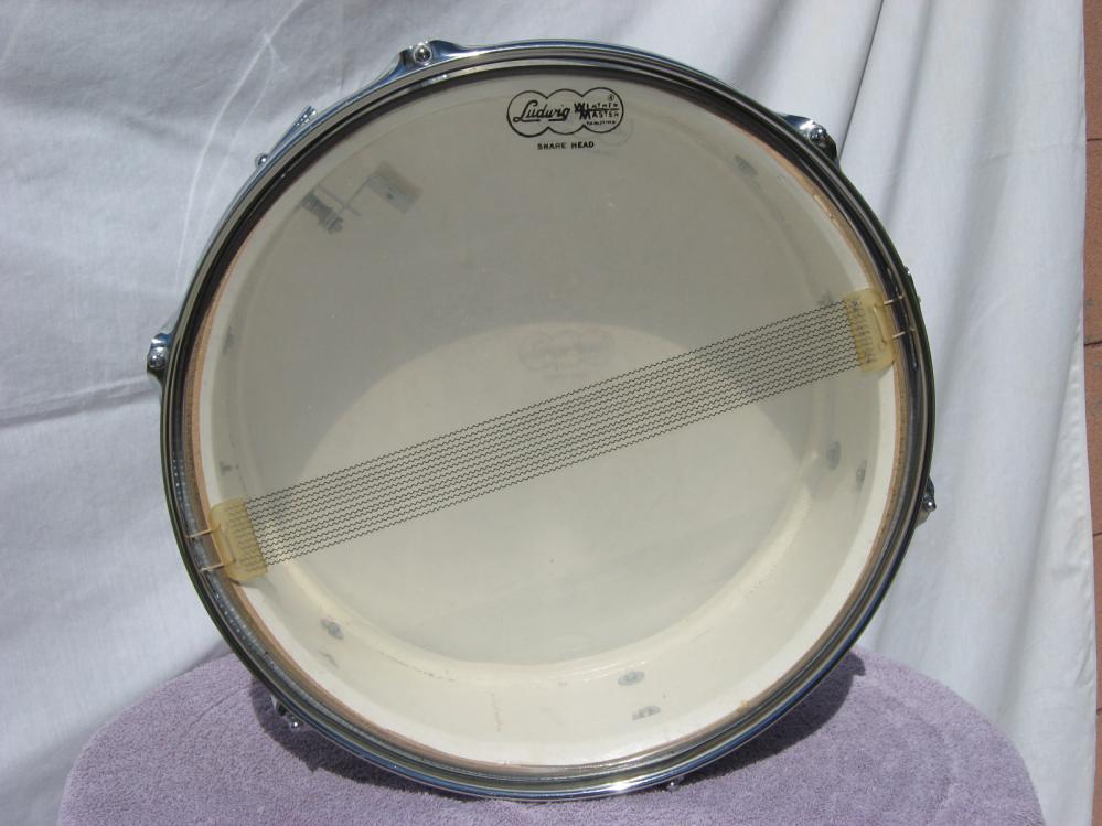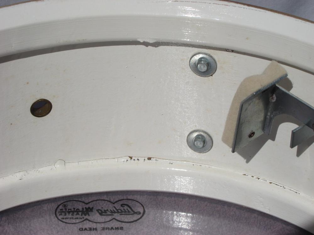 The shell is 3-ply Mahogany/Poplar/Mahogany with solid maple reinforcement hoops. However, looking closely, the shell looks more like Mahogany/Poplar/Maple. Hard to tell what Ludwig may have used! The original RESA-COTE paint still looks very white, with some typical flaking from age. The WMP wrap has only SLIGHTLY faded. Definitely not "yellowed", but more "mellowed". Looks beautiful! Yes, the wrap is lapped into the seam! There is a very slight "pucker" at the seam, directly above the lug, which you can see in one of the pictures. Really not bad at all, but needs to be mentioned.