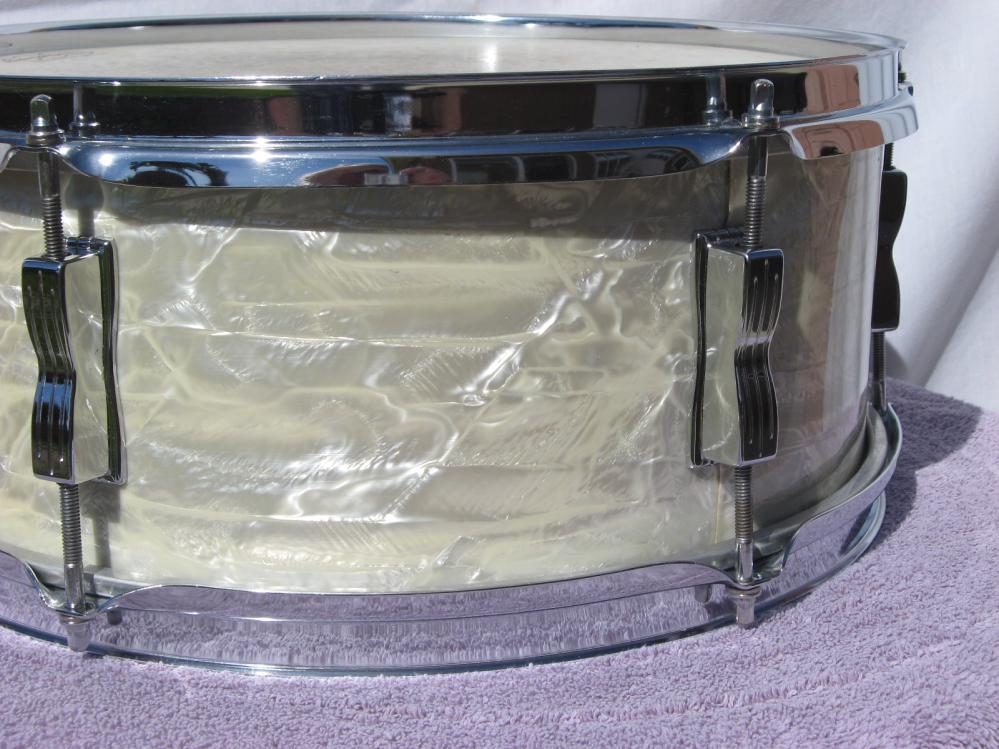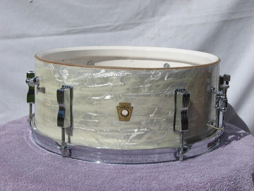 First up is my beautiful 1966 Ludwig Pioneer snare drum, 5.5 x 14 (yes, it measures an actual 5.5" deep!), wrapped in White Marine Pearl. Keystone badge with serial number 340360. Black-ink date stamped SEP 16 1966