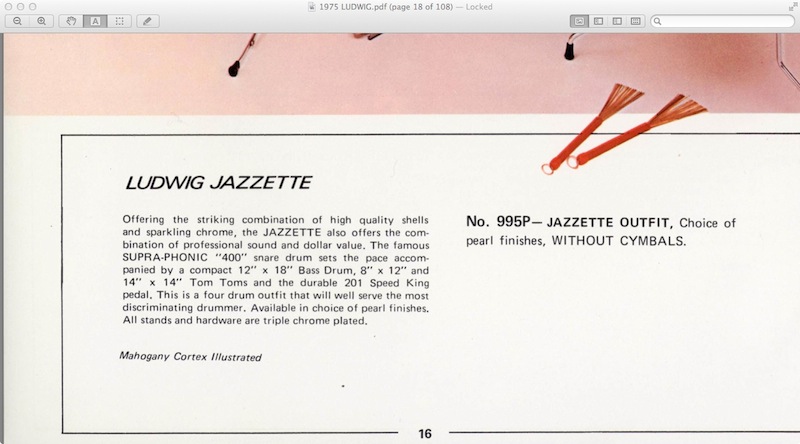 @ mbira: Welcome. The spurs you are describing sound like a different style of Ludwig spurs from the ones usually found on the Jazzette bass (those straight retracting ones as on my kit above). Mine is a 1969 so I doubt the change is some systematic change in spurs based on what year the kit was built. The usual spurs were retracting straight ones before 1968 and retracting straight ones after 1968. Yours could have been ordered with folding spurs. There are always anomalies compared to the catalog.