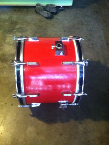 7: Tama Rockstar Pro...(I think)...16x22 bass drum. At some point stripped of wrap--not by me--and painted gloss red. All lugs and t-rods are there in pretty good shape, leg mounts and tom mount as well (no legs though). Remo pinstripe batter head (with an internal remo muffler) and oddball King's Stone resonant head. A nice sounding drum as sits. $75
