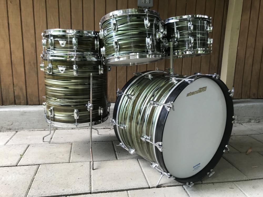 Ludwig Standard "S-330" Avocado Strata drum kit, sizes 22x14, 12x8, 13x9, 16x16 with matching snare drum, dating to 1970. All drums are 3-ply with reinforcement rings and factory "granitone" interior. No modifications to any of these drums. A couple small hairline cracks in the bass drum and floor tom. Bass drum also has some rash. A couple of the drums have date stamps, one reads "1970" but all the serial numbers are factory-matched, so its fair to assume they were all born together that year. Some fade, primarily on the floor tom and snare drum. Some rusting on some of the interior mounting hardware. Original t's and claws on the bass drum, minus the t's which are ludwig classic handles instead of the standard type. Chrome has some pitting and signs of rust. Bass drum is missing inlays. $1200 plus ship