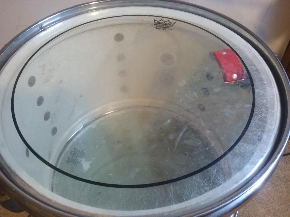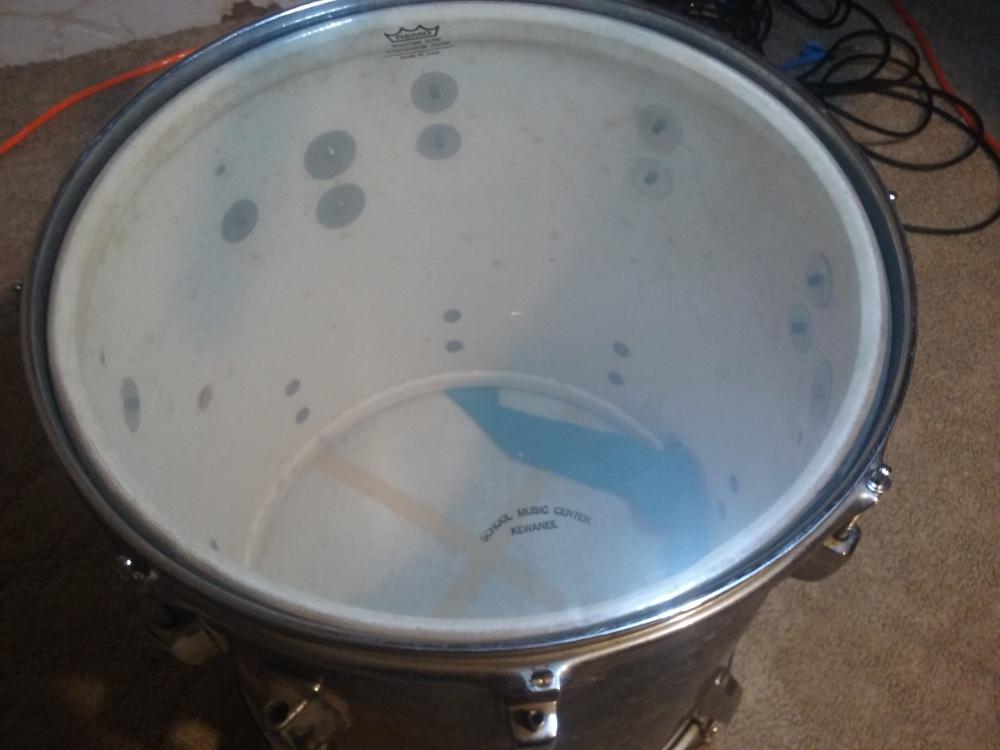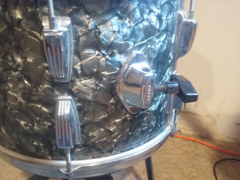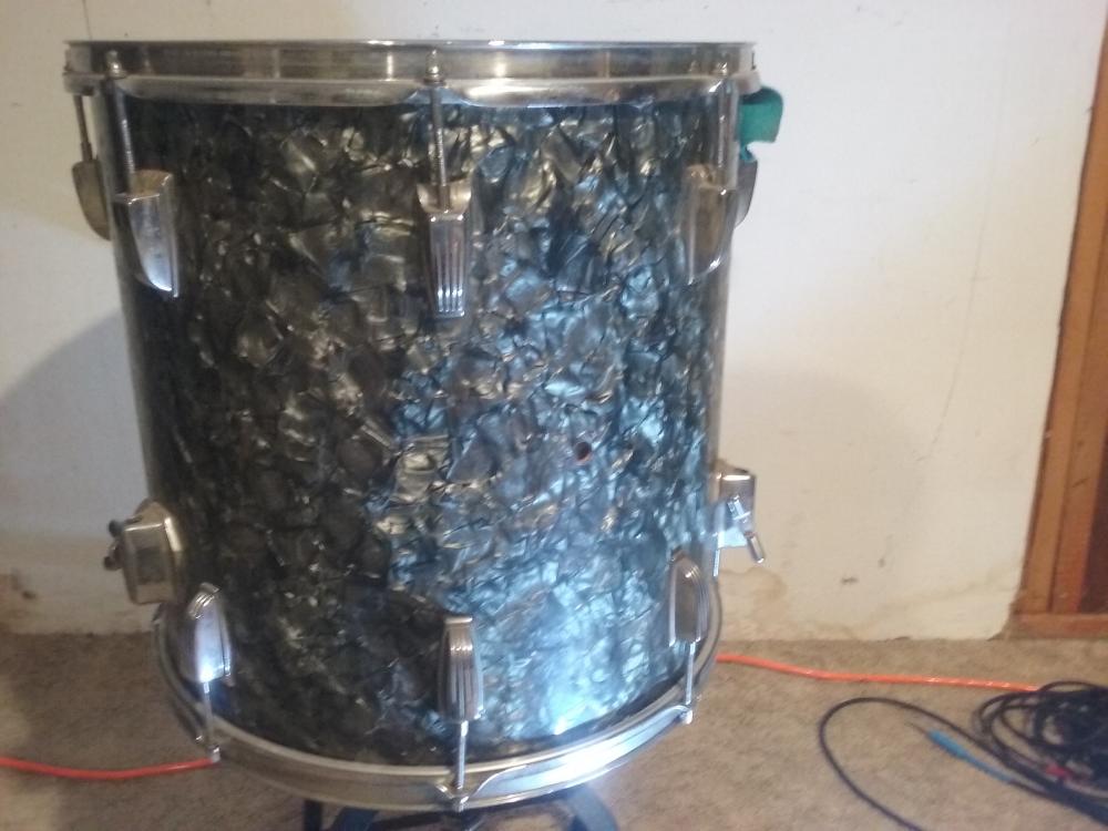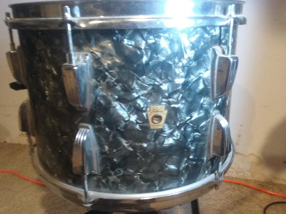 16x16 Floor tom, badge is missing and the hole looks like it was messed with ( too big now). The legs are gone but the mounts look original. The wing nuts to tighten the legs are missing or not original.
