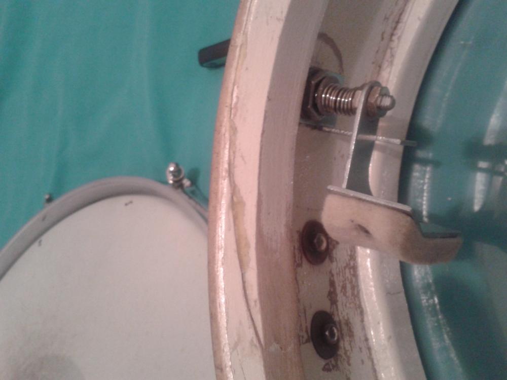 There was also a bit of ply separation at the re-ring, and looks like the previous owner glued it back into place.. It's a little sloppy, but holds well.. I think some light sanding and lacquer will fix that right up, as it's really nothing major..All original lug screws are present except for one that was broken when i got the drum, so i replaced it with a generic screw that i had in my box of parts.. I have a bunch of large classic lug screws of different lengths that i got when i ordered some to restore my Rocker kit, so maybe those would fit ? If you think they would, i can include a few..Rims seem to be original, but again i'm no expert in that department, so hopefully the pics will determine that as well..