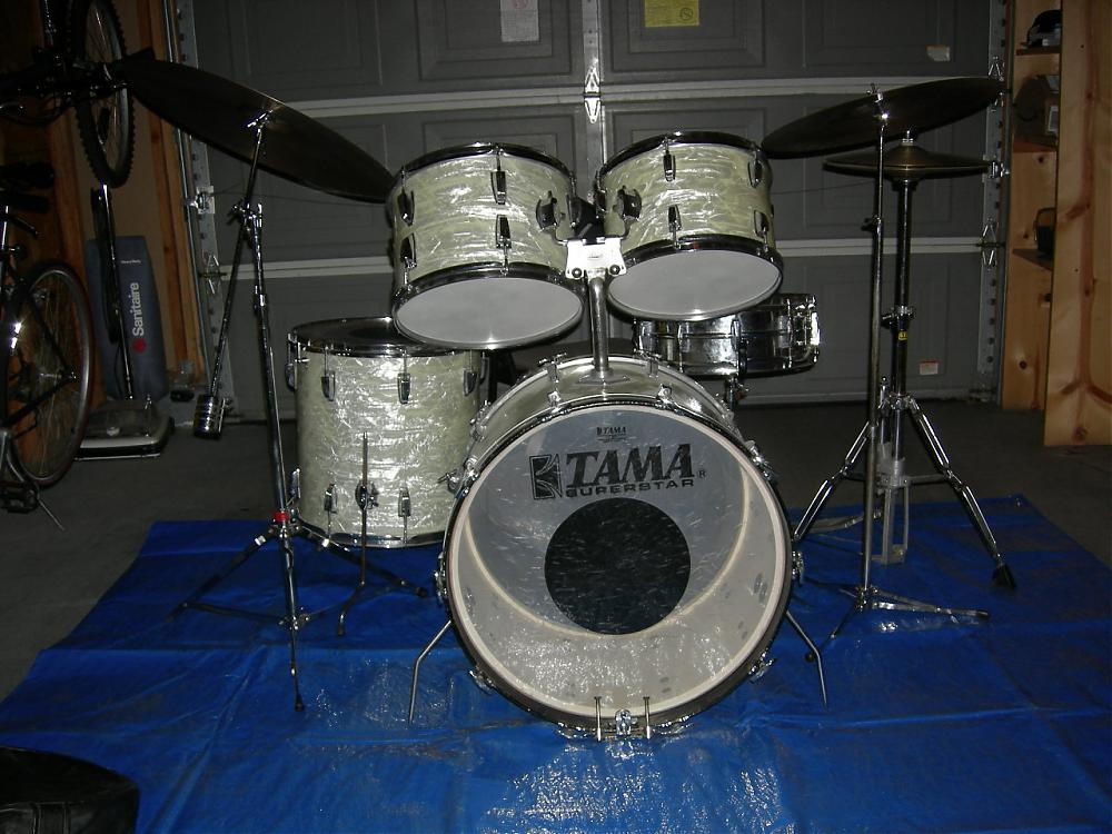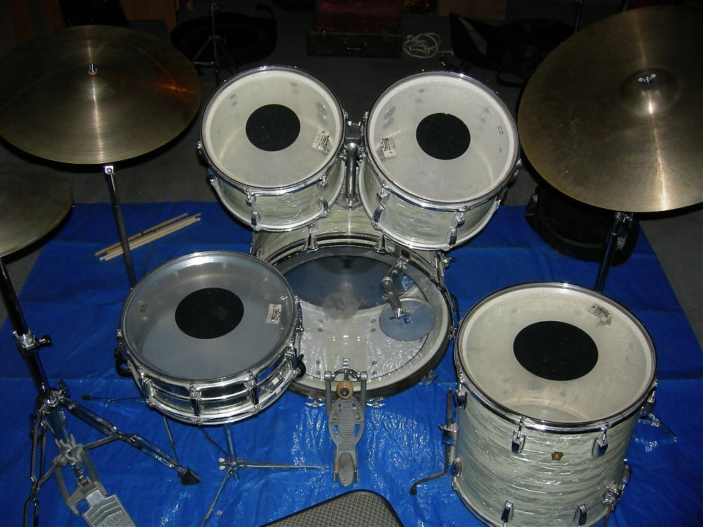 Now for some questions. I can't seem to adjust the height on the Tama Hi-Hat stand because I think there is a small lug wrench I don't have that tightens the ring that determines how high the adjustable hardware goes. The original Ludwig Hi-Hat stand looks like it just needs a soft pad that the bottom hi-hat rests on. There is a piece of hardware that is attached to the front of the bass drum that looks like it was designed to help balance the bass drum with the kick pedal side. Is this true? I don't see this piece of hardware on any pics I've seen of other kits. Is the bass drum mute supposed to be on the kick pedal side? I always seem to see this on the front (non kick pedal side) whenever I see pics. And, this is the first time I've tried to set up the kit, am I in the ballpark regarding where everything is supposed to go. Are the toms too angled, high, not high enough, is the snare too close to the bass drum, etc. I know everyone has a slightly different setup, but I really need some advice. The keystone badge dates the kit to 1968, and the snare dates to 1967. If you have any questions, I will try to answer them. I am looking forward to your comments. I'm a total newb with setting up drums. I've played a bit on bandmates' kits over the years, but when you have your own kit, it's a completely different story to say the least.