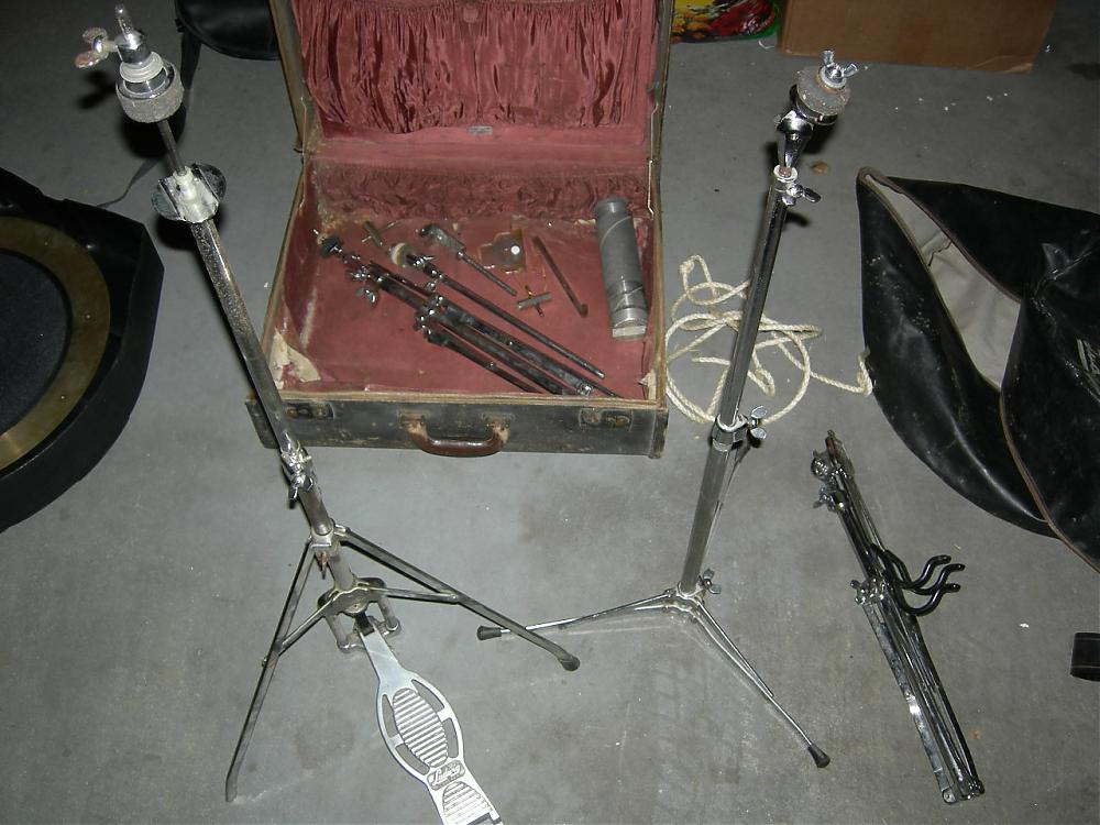 I picked up this kit and have many questions about it and some of the hardware that came with it. The kit came with 3 Paiste Formula 602 Cymbals of varying sizes, one with the sizzle holes and rivets. There is one Avedis Zildjian crash cymbal (shown in kit pic next to hi-hat). The hi-hat cymbals are Zildjian new beats. I need to measure these to be able to tell you what I have. The hardware for the Ludwig, and some additional pieces like a Slingerland cymbal stand and a Tama Hi-Hat stand (shown in kit pics), and a WFL snare stand (shown in kit pics).