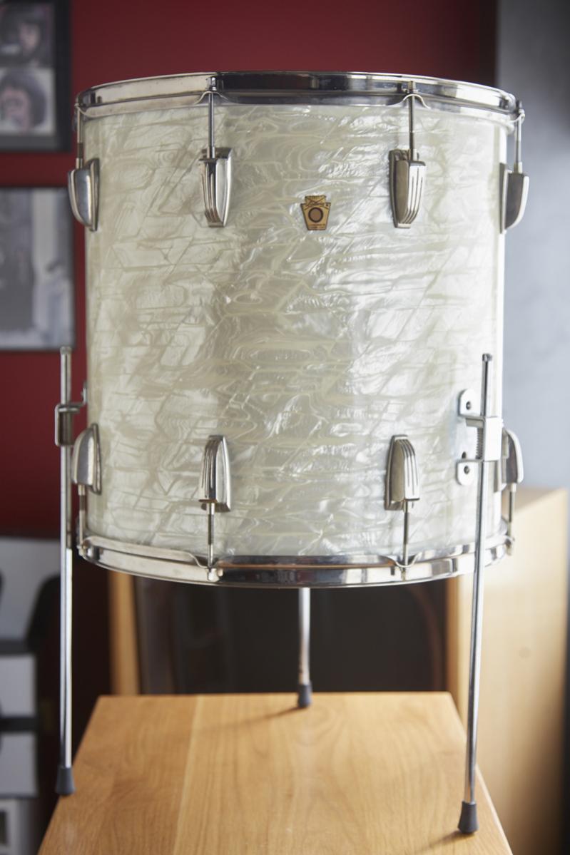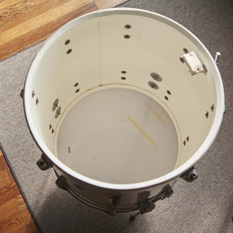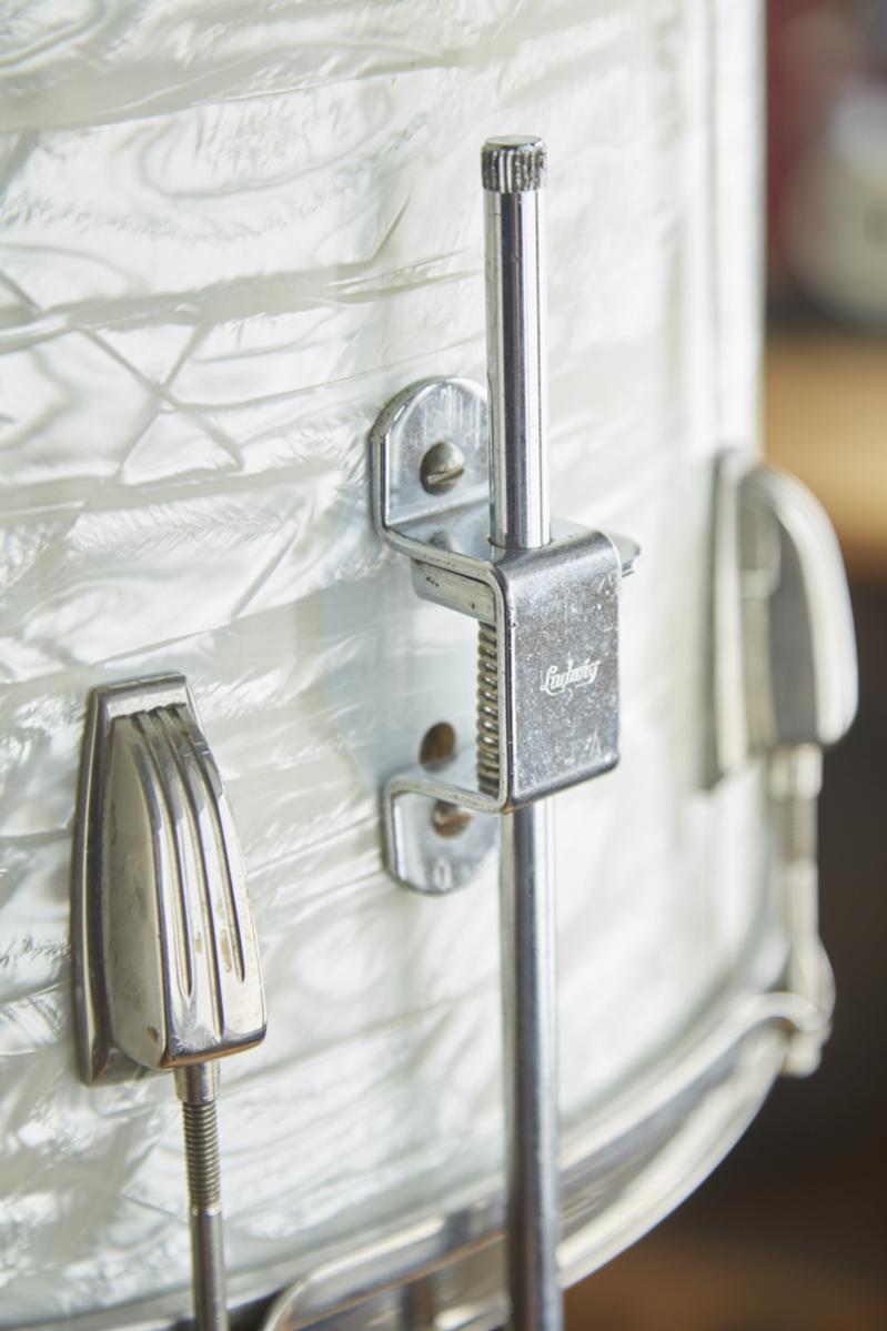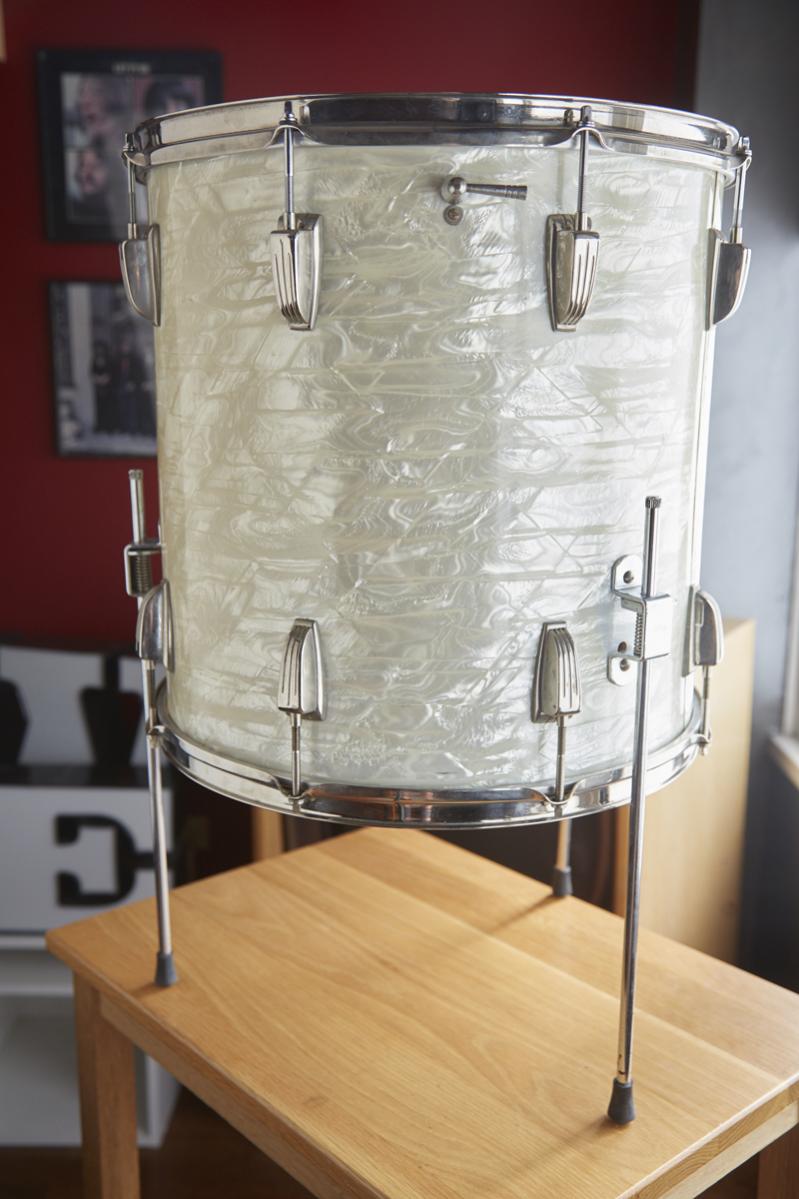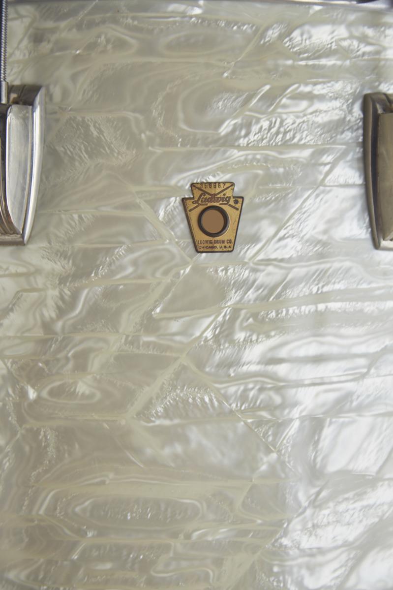 Original white marine pearl wrap -- in very good condition, very even finish, typical yellow patina, no shell damage, excellent shell bearing edges. Original white shell interior with original reinforcement rings. Shell is in round. Nickel lugs and hoops with the older spring loaded straight legs in chrome. This must have been modified as there is one extra hole near leg mounts. A killer floor tom.You will want to replace the heads...or not. $50.00 shipping charge to the lower 48