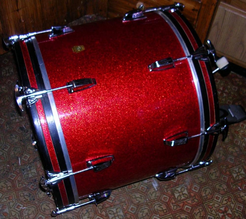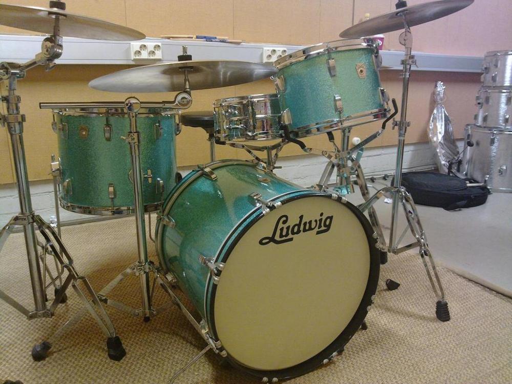 Looks to be Ludwig but I'm not sure what exactly and I can't see the details well enough to tell for sure. The floor tom looks like it might be a converted 12x15 marching drum and as such it would have had the small lugs. An 8x12 tom also would have the small lugs although that almost looks like the newer style badge on it (the floor tom badge almost looks like it could be a "transition" badge from 1958-1960 with the blue oval logo). The bass drum is a bit odd looking. I can't tell if it has the larger lugs (which they should be) or the small ones but their placement seems a bit "off" as though they are too close to the heads. The badge is likewise oddly situated for a bass drum. Possibly some type of conversion from a floor tom , marching drum, or other 18" shell. For comparison here's a picture of my 14x18 bass drum.