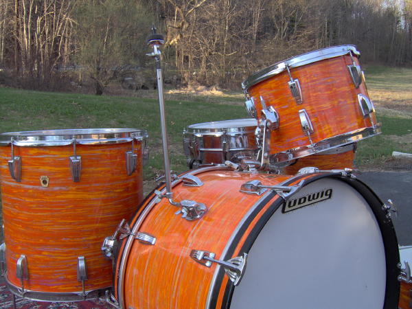 And wflkurt...rail mount is included, but unfortunately the kit is not original. I had a few repairs done to them by the world famous Sam Bacco: re-glued the seams, the edges were not original so I had him re-cut them just to get them even, and one of the spurs had been impacted, so he repaired that, as well. Oh, and I also had him repaint the bass drum hoops as they were in pretty sad condition.