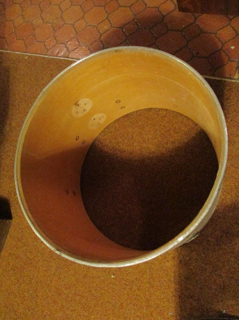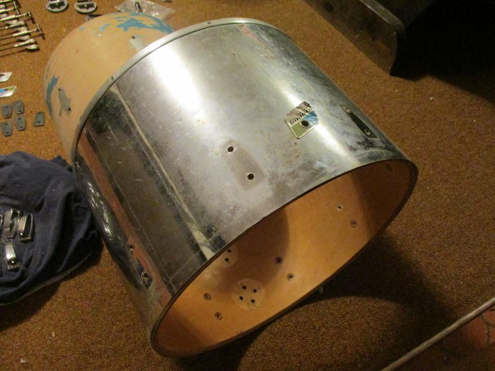 Starting to clean house a bit. Thought I would start with a few items on here, and see if there is any interest at all. Not looking to make bank. Mostly passing on a few projects to others... The 18 shell is a 6 ply concert tom drilled for Large Classic lugs. I saved it with the thoughts that it would be a killer bass drum. Also there is a very heavily moisture damaged 13" tom. Good badge, good mount, and good muffler. I had intended to make a copy porto pac snare out of it. I don't need to sell this all together. I can pull off parts. I also have the tooling and skills to get either of these drums to a point that you would like them. Drilling, wrapping, edge cutting, re-ring install. etc.