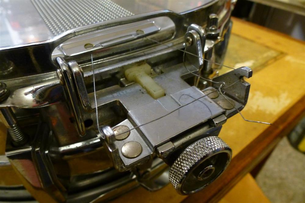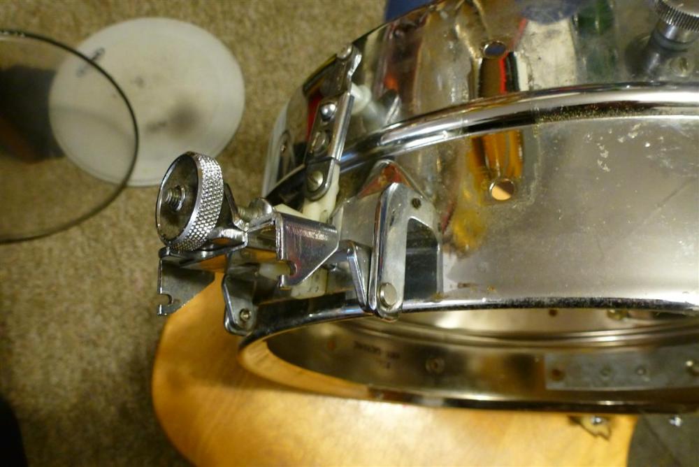 I'm puzzled by the strainer. The former owner told me he didn't have the proper snares for it so he rigged the current snares to fit....see wires. He bought the snare drum new but couldn't remember the year....maybe late 70's he said. I do have the Ludwig book and it looks like the S/N and badge puts the drum 1978-79.