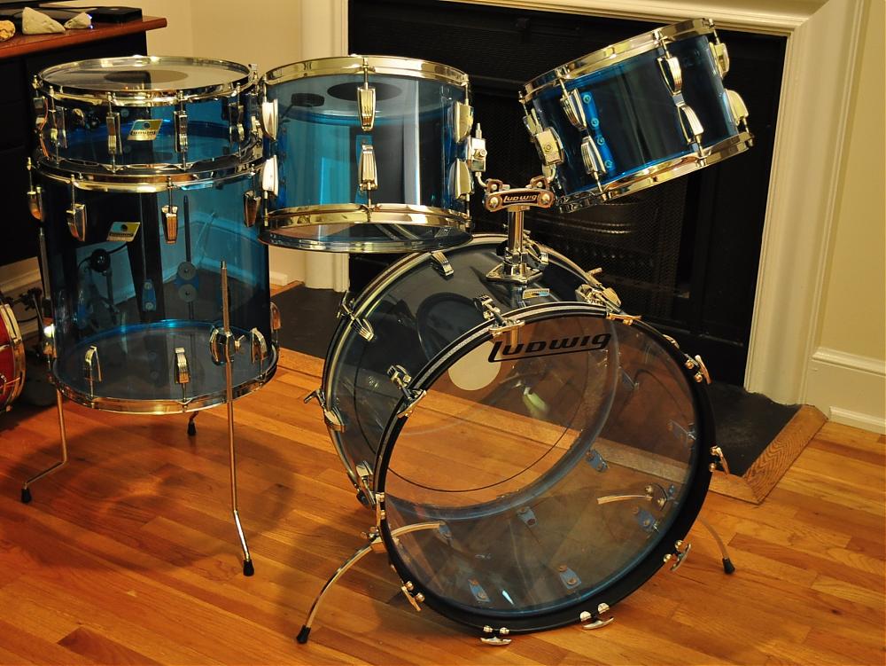 Selling my late 70s Ludwig Vistalite kit. This is the "Big Beat" model -- sizes 8x12, 9x13, 16x16,14x22, with a matching 5x14 snare, which has a crack that was very well repaired. The drums are otherwise extremely clean and sound awesome. Newly refinished bass drum hoops with new silver sparkle inlay from Precision Drum Co. Chrome gleams all around. Asking $1200. Open to trades for other vintage drums.