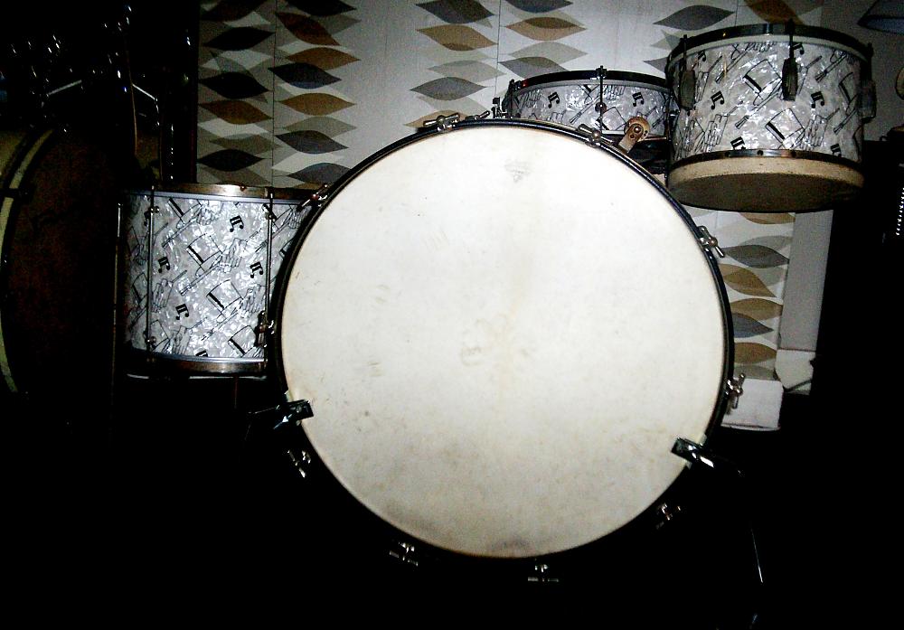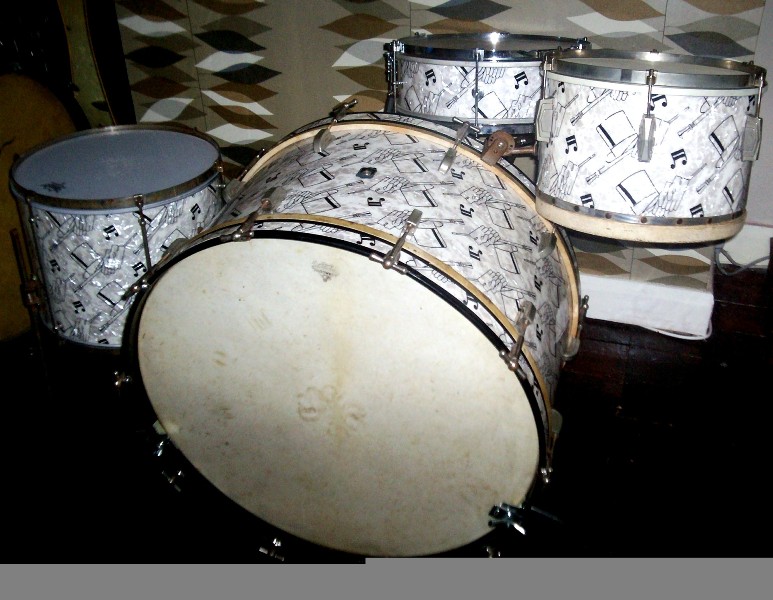 The set consists of era correct Ludwig shells (late 30's to early 40's - time period when the original Top Hat and Cane wrap was produced). It includes a Leedy 14 x 26 bass drum with original badge, a Ludwig & Ludwig 9 x 13 ride tom with original badge and original tacked on bottom calf skin head, a WFL 12 x 15 tube lug floor tom converted from a marching snare, and a Gretsch 4 x 14 6-lug single tension snare equipped with the original Perma-Tone head, silver sealer shell, and a P-83 strainer.