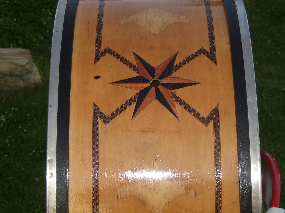 over maple. 3 coats of shellac, painted hoops black (original color)