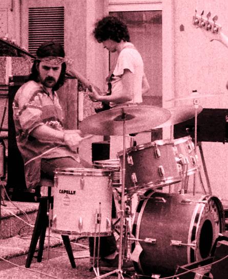 The two others pics show the same 505 outfit with the wrap removed, circa 1986 with Capelle Turbo 14' tom floor . Zildjian cymbals.
