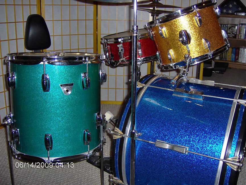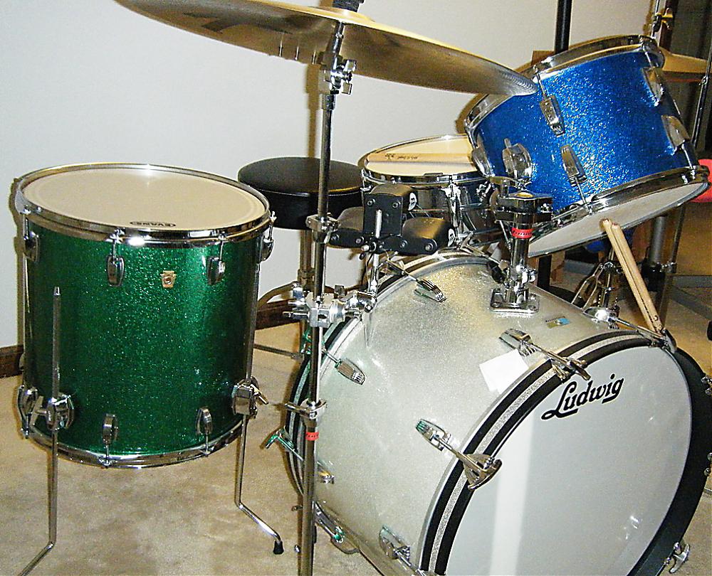 1969 Ludwig Green Sparkle (faded Blue Mist) Standard 14 x 14 floor tom1970 Ludwig Blue Sparkle Club Date 20 x 14 bass1971 Ludwig Gold Sparkle 12 x 8 tom1972 Ludwig Red Sparkle Pioneer 14 x 5-ish snareLudwig flat snare and cymbal stands (Camco in pic - oops) and hi-hat standThe bass hardware is made up of old WFL bowties and claws, a seriously old bass tom rail that I modified, and some relatively newer wing spurs. This kit just screams "MUTANT".Calf skin on the toms and Fiberskyn's on the snare and bass.One of the most fun projects I've done. It just came together piece by piece.