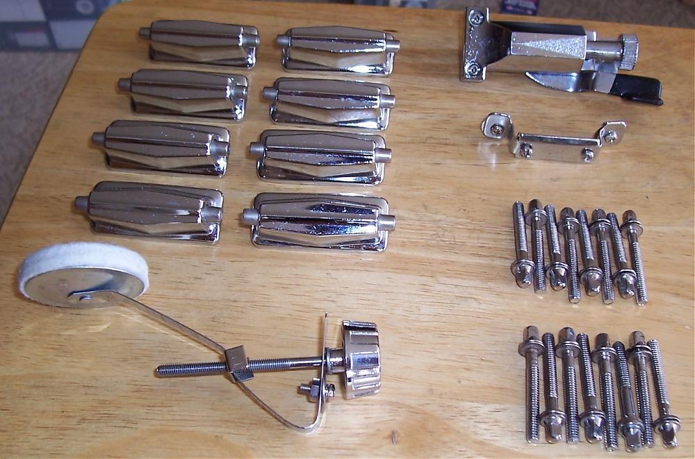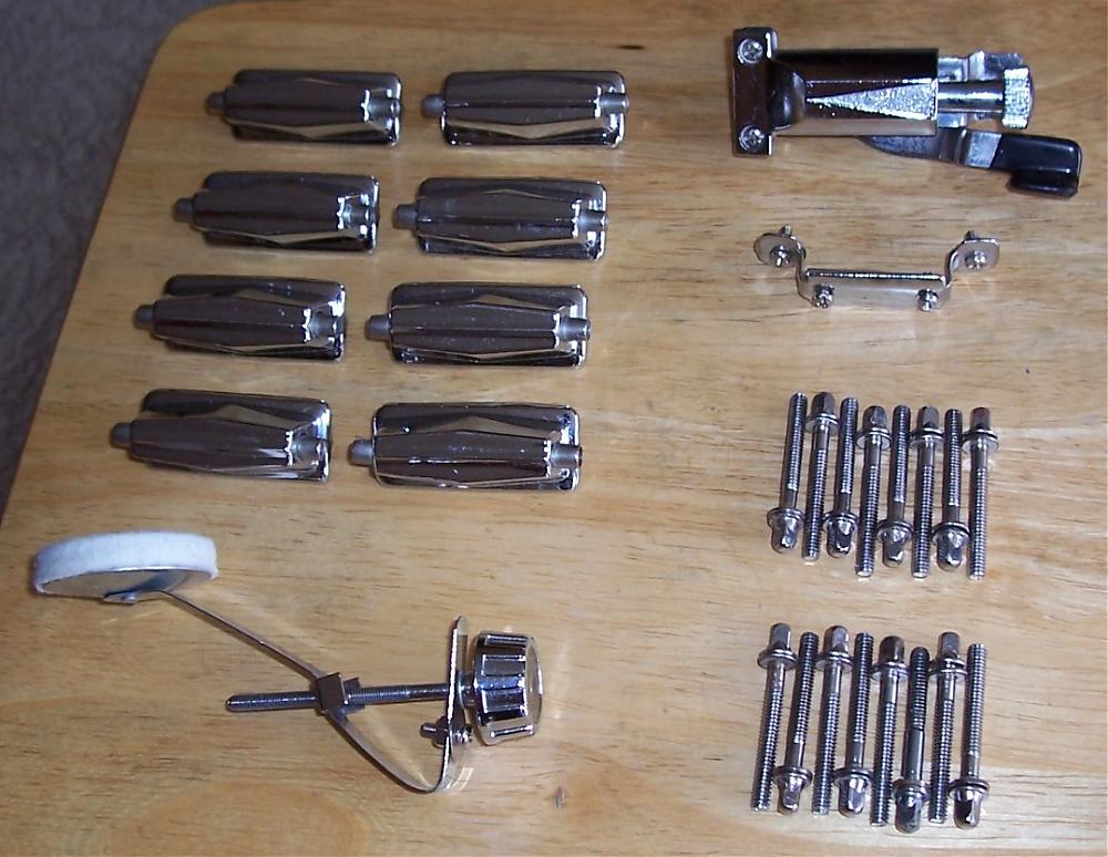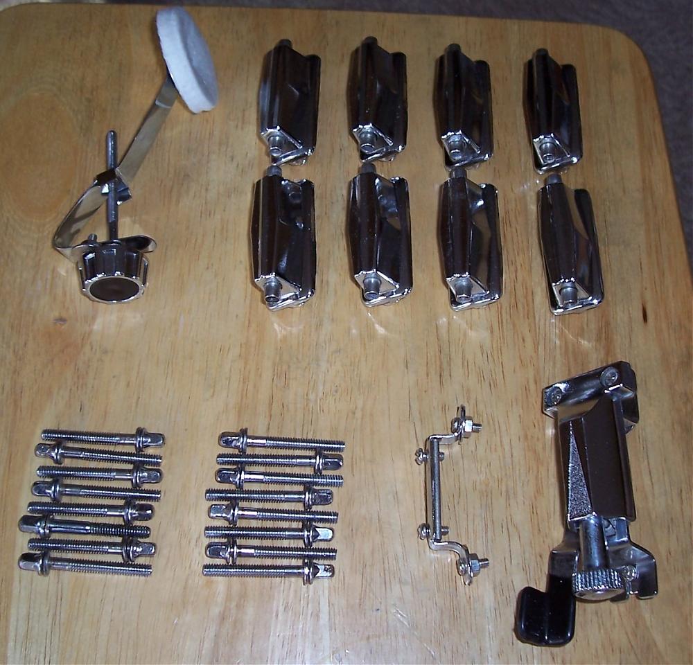 I've got some hardware that I want to get rid of that was removed from a MIJ snare drum. Included are 8 lugs (with mounting hardware), a strainer & butt, a muffler assembly and 16 rods w/washers. I haven't cleaned any of it but I'm sure it should clean up quite nicely.