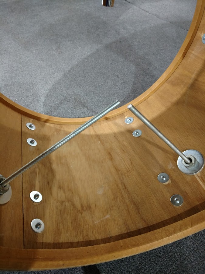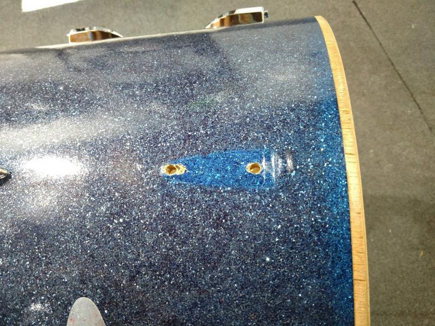 Bass Drum: 6 lugs, natural interior with re-rings. There is some fading/darkening/slight buckling of the wrap on top (buckling is at the lugs-See "Olympian 9"). Shell is good and round, but there are some water stains on the interior and I filled in some of where the wood "peeled off" from the factory tom mount drill (See "Olympian 7 & 8"). Spurs were missing when I obtained them, and the brackets are a very odd size. Too small for standard 3/8" spurs, but a little too large for 5/16". So I used long 5/16" screws cut to the appropriate length. I know they don't need to be threaded, but the "ridges" of the thread help them fit a little tighter in the brackets and let the wing screws hold them better. They hold firmly with no problems and have rubber tips that fit snugly. (See "Olympian 8"). Finally, with the odd threaded and non-universal threaded inserts the lugs have, I couldn't find key operated tension rods to fit the existing threading, so I replaced all the bass drum lugs. They match almost exactly to the rest of the kit, and the hole spacing was almost exact, I just needed to widen the inside hole slightly, but you don't notice it at all when assembled (See "Olympian 9"). Gibraltar bracket installed for the cymbal L-arm (same hole spacing), and I will include the bottom half of the cymbal L-arm (needs the top half).