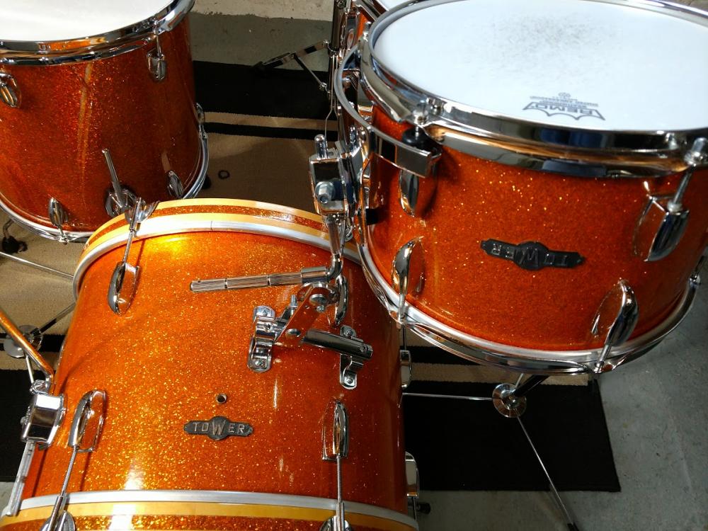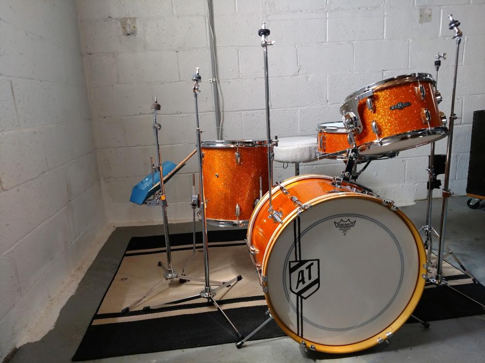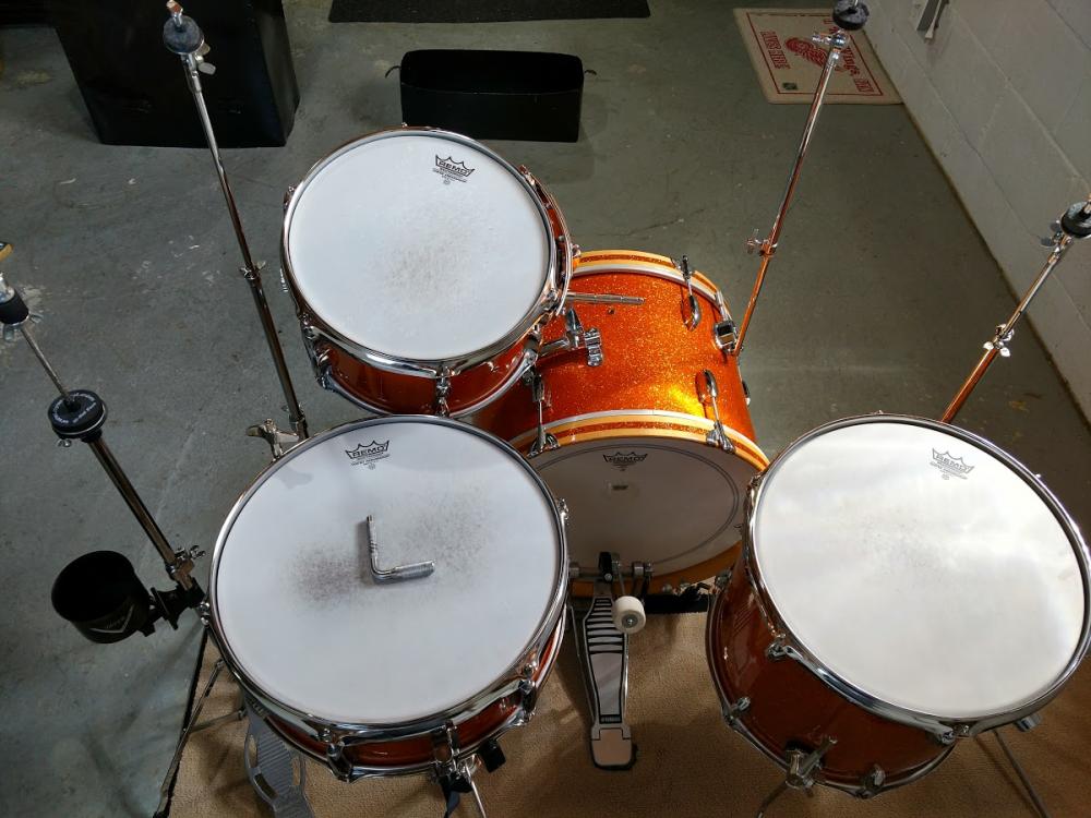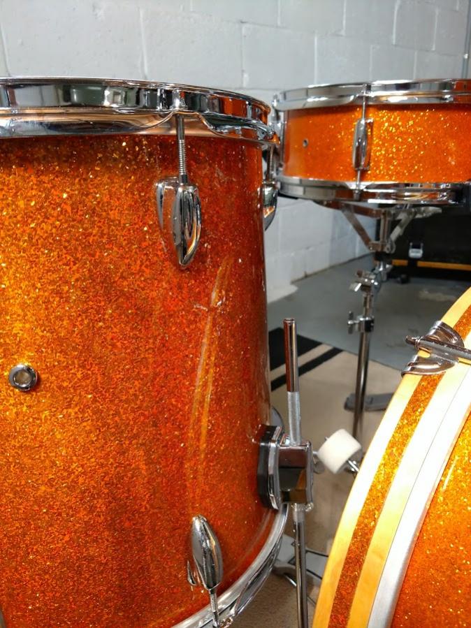 The kit was originally only Bass/Rack/Snare. I added the floor tom shortly after I bought it about 4 years ago. Musician's Friend had a Sound Percussion brand 14" x 14" on clearance for cheap, so I got that, stripped it down and filled all the existing holes (except the air vent). I had some Slingerland copy MIJ lugs laying around, so I used those, along with Ludwig leg brackets (I also swapped out the cymbal arm and tom brackets to Ludwig, because they have eye bolts (originals did not). The hole pattern was the same, no extra drilling)! Plus, I like the fact that all the brackets match. I had to use the official Ludwig spacers for the floor tom leg brackets. They look a little bulky, but do what they intend (Photo 5 shows a close up). I ordered "Gold Glitter" wrap from Precision and it came out great. The floor tom is just a tad less orange than the other drums, but it's darn close.