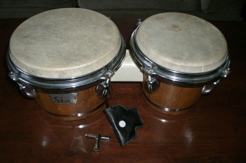 A few minutes ago, I picked up my new set of Star bongos from the local post office. They are near mint! The white plastic bridge needs a cleaning as do the lugs and rims but, there is no rust or pitting whatsoever. The original calfskin heads are aged with a dark patina but, not a single small rip or dent can be found. What I'd like to know though is this: on my other Star sets and other pair of bongos, the badges have "Finest Quality" or "World's Supreme Quality" printed on them. This badge is a stylized rectange with the greater length at the top. Above the typical word, "Star" is the phrase, "Perfect Percussion". Below the "Star", "Made in Japan". I'm estimating the bongos to be from the early to mid sixties but, I'm not sure. Any authoritive placing of age on this set would be greatly appreciated. Thank you very much, gentlemen.