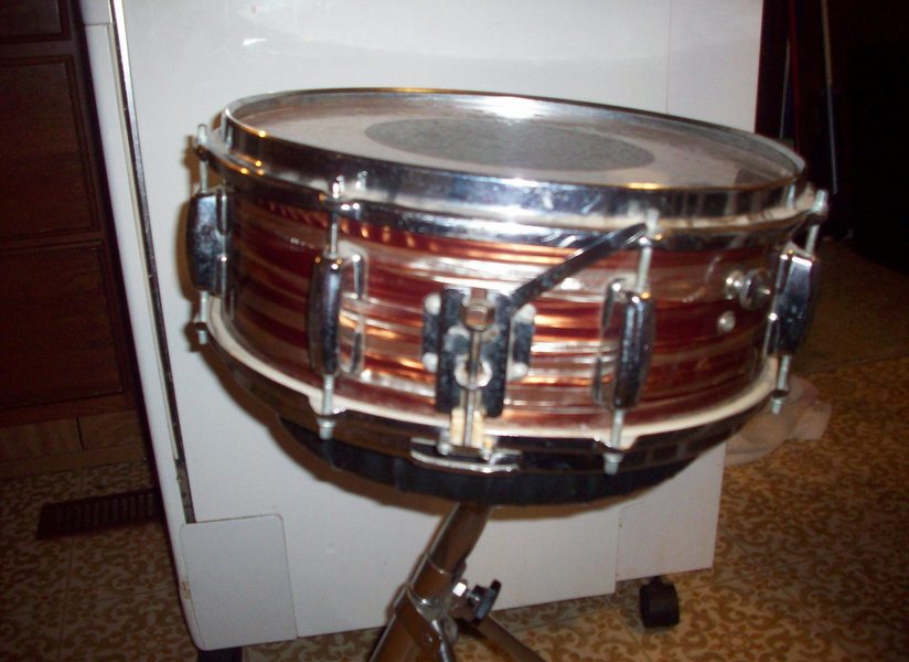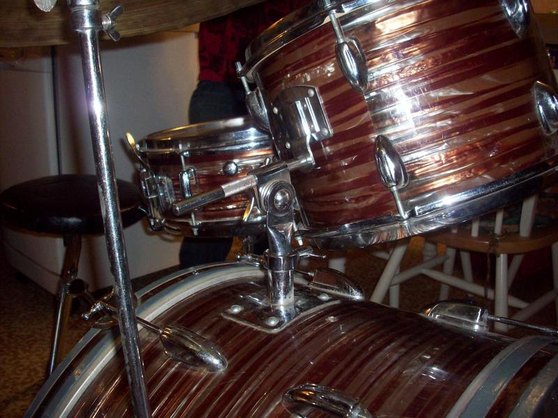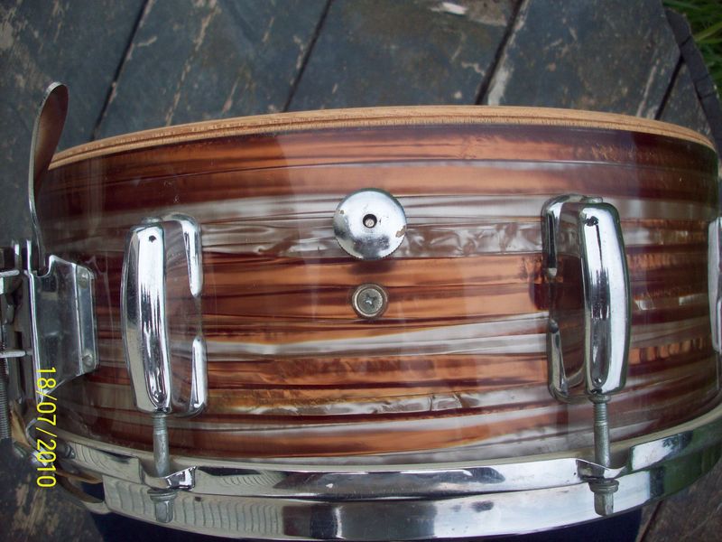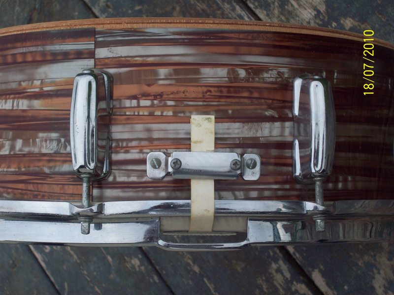 Would you let us in on how mucho dinero? This is just an amazing find. These early Stars are so rare and hard to get, let alone in desirable wraps. This is a oyster pearl wrap, I want to say ruby...? Is that likely what it could be? The reason I am certain it is Star is because of the snare and bass lugs, and the bass T-rods. That is one cool strainer as well. If you need to repair it, let me know. I think I have an exact replacement I can exchange. I'll look in my new pile.