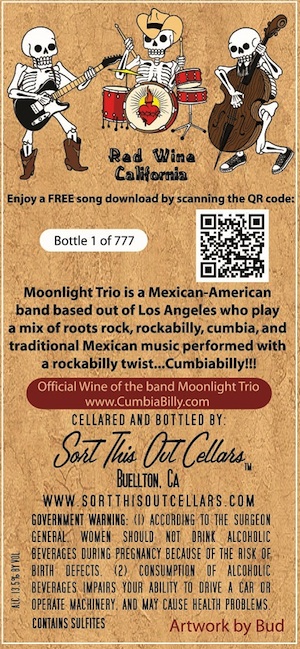 Check out the cool artwork/labels that will be gracing a limited edition run of wine from our pals over at Sort This Out Cellars in Solvang, CA. There will be 3 different labels/bottles to represent the 3 members of Moonlight Trio. The red wine is even a blend of 3 different grapes! Oh...and we're also giving away a free song download with each bottle. My tattoo artist drew up the Day of The Dead skeletons for us...and to our own likeness, too. Will be out next month...totally stoked! Just thought I'd share with you all here. I'm more of a beer guy...but I guess I'm officially a Wino now.