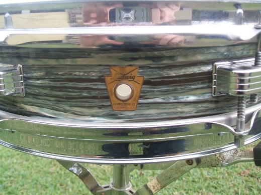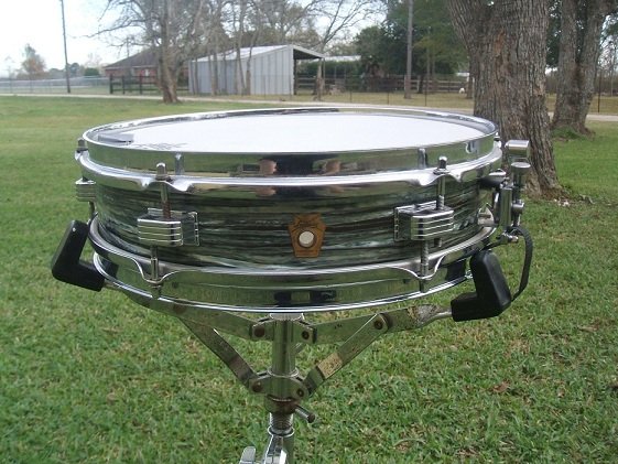 That's a nice one there! Your daughter did great finding that one! I have a similar drum, 3x13 in Blue Oyster Pearl. I had to replace the strainer on it because some of parts were missing. I wish I could find a complete one like the one on your drum.