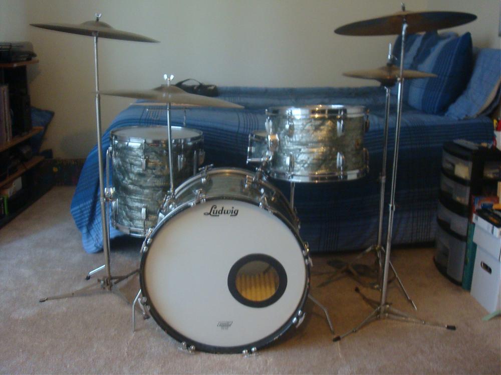 One tip to you guys if you want that really vintage sound out of the bass drum.....lose the hole in the front head. Put a solid head on the front again and use felt strips for muffling with nothing else in the drum. It will sound HUGE! :DNo that's true old-skool vintage! :D