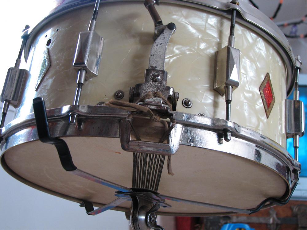 I have been focusing now on the Leedy snare. Its' missing a few key pieces (the internal snare assembly, head damper etc) and I've decided that, through a friend, I would have a couple of them fabricated. Here's a photo of where I'm going. I at least have the one tensioning knob to work off. What I don't have, is any image of the small retaining box that fits in and holds the snare wires - am I making any sense??