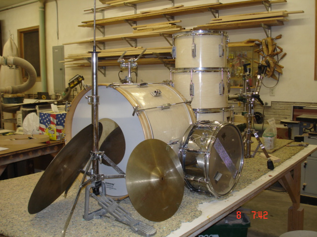 This kit has a funny story with it. I saw it on C.L. one Saturday and saw a blury (typical cl photo) pic of the badge. Thinking it was a Standard kit, which I had been wanting, I called him and asked for better pics. After I got the pics I had seen the badge said Educator on them. SO I posted a pic here on VDF to find more info. Turns out the selller read the thread and raised his price from 325 to 500. I told him I cant pay that much and hung up the phone. He called back an hour later with a counter offer of 375.00 and I agreed. The next day, Sunday, I took off for DeMoins Iowa, 3 hour drive one way. Left at 5:30 AM because I wanted to see the Bears game at noon. Drove about 15 minutes and thought, what in the hell are you doing, this is crazy. Your gonna drive for six hours for a cheep Ludwig kit? Well, I kept going and was back in time for kick off.