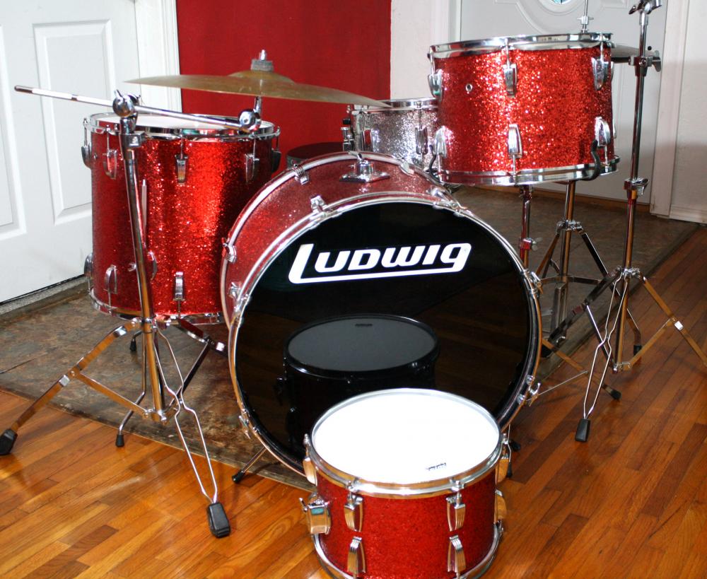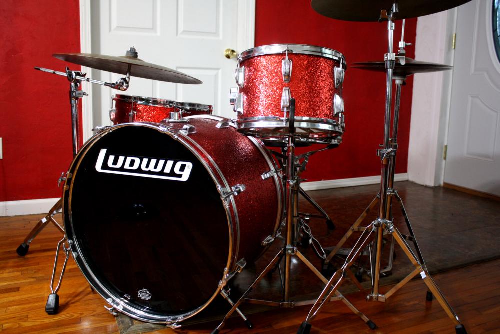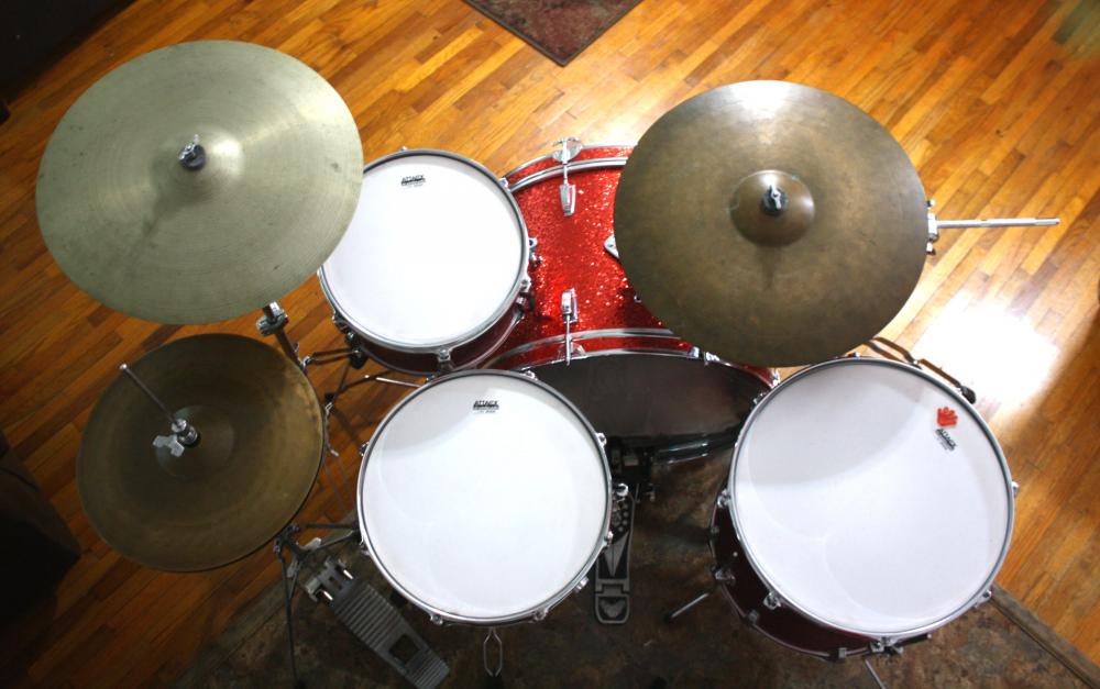 The kit has been recovered because the wrap was bad on the toms and also to match the kick drum. The 3 toms (12, 14 & 16) are re-ring Blue/Olive drums. The kick is a 80's USA rocker drum with classic lugs to match. The snare is a generic / non matching snare. It has all of the stands (snare stand for rack tom), pedal and throne included. The hi-hats and ride are CB700 Italian stamped cymbals with a Krut 18" crash as well.