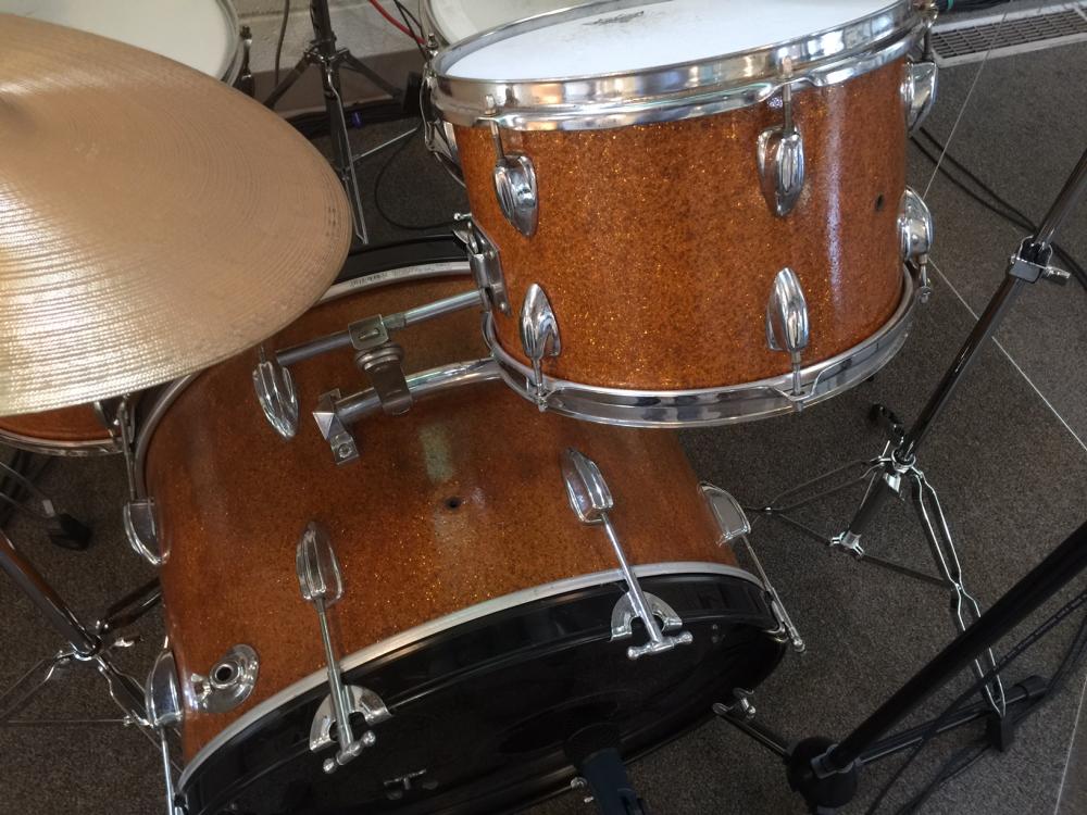 I found this MIJ kit on facebook, in another town, and so I had my dad go buy it for $150. Then when I went to go pick it up and pay them back, they told me to keep it for my birthday! It was advertised as gold but I think it's orange. It was in great shape with ambassadors all around and a remo PS3 i think on the kick, which has replacement hoops.