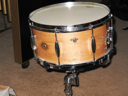Bought for $450 online, it was painted blue and, under that, pink! So, I sanded and refinished natural. this is a 1940's Buddy Rich model (beccause of the cloud badge and no bridges) It is a really great sounding drum!