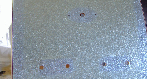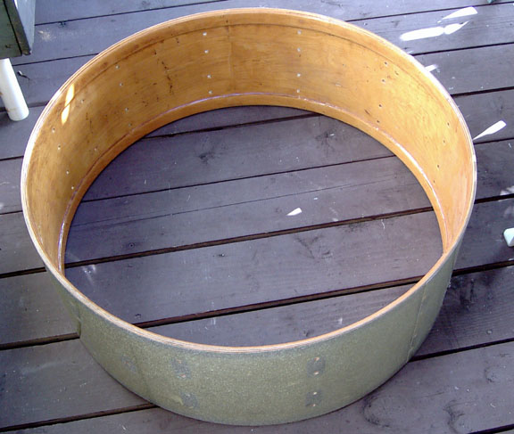 It measures 28" x 10", a thin or Scotch marching bass drum. The shell is covered in silver sparkle wrap, and the whole thing looks real tight and solid, a better-than-average made drum to me. The inside has a beautiful coat of clear on it. There's no stamps inside.