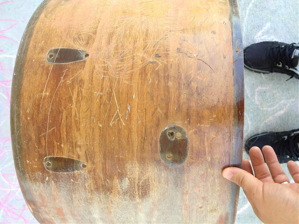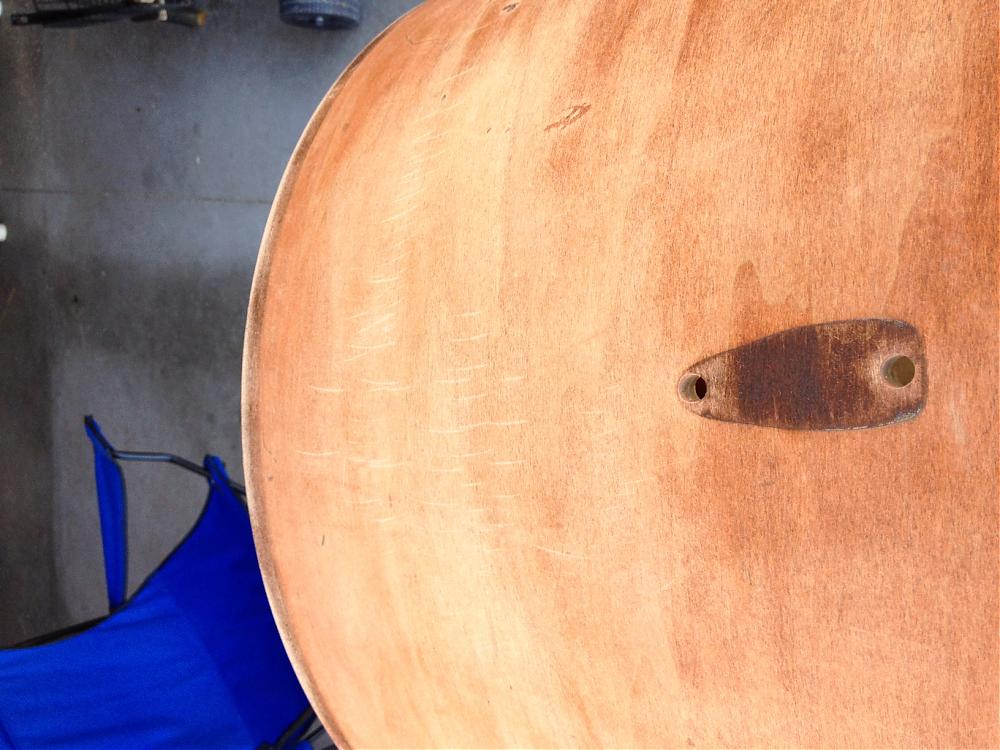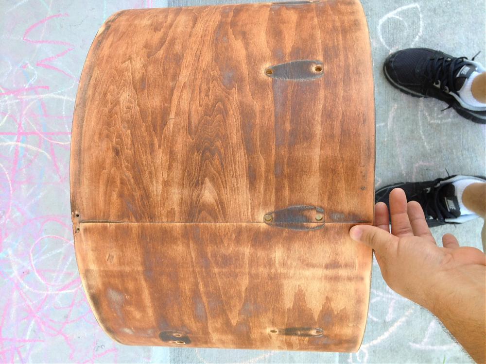 I bought these shells a couple weeks ago. Was going to sell them here and then when no interest appeared I decided these would be good shells to practice on and try to improve my non existing skills. I think I want to do a dark stain on these. The bass drum already had some sanding done on the top of it. Lots of scratches. Some are still showing after sanding. The top doesn't look as good as the bottom still even after sanding.