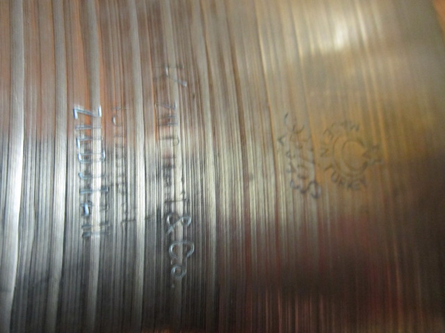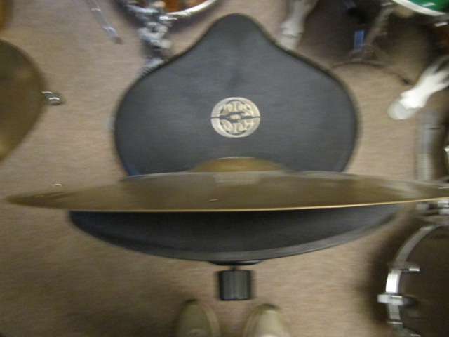JDA, You shamed me into actually taking some photos. Sorry for the quality, I have no flat surfaces in the drum room. I owe some sound files to various folks. Can I post audio files made with a Zoom recorder? If not, I can ask my long suffering wife to make a video on her cell phone. Here are five shots of the 17 and a half or so diameter cymbal. I nicknamed it "Chunky" and it does not seem to mind. I did not weigh it when I did the others. It only cost $100 from Olympia Drums and Percussion. I love playing the sides of the chunk with a bass bow (Pop's rosin is the best) or stick or one handed brush strand mandolin rolls. When I played in the local orchestra we had a pair of 22" (I think) ancient K's that belonged to Fred Hinger. His son Bill played them once in a while when the music was especially pompous and he had the physical strength to hold them. They weighed a ton but sounded heavenly for some crashes. After one concert a very nice and well meaning gentleman offered to buy the symphony some new crash cymbals so we would not have to use the old broken ones. Bill's father bought them from a former vaudeville theater drummer and they had been stepped on somewhere along the way while he owned them. They still sounded amazing. Thanks for the interest and information!