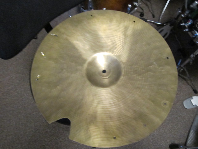 Here is the text from the Olympia Drums and Percussion web site: "Here is one of the best sounding and ugliest cymbals we have ever found. We don't normally list cymbals with this much damage to the plate but this cymbal sounds so good that we want to find it a new home. There is no stamp on the cymbal. It must have been cut out with the edge repair. We attribute it to K. Zildjian based on the bell shape, hammer marks, and tonal quality. It has a beautiful, warm, even distribution of overtones that will sound beautiful as a suspended cymbal in an orchestra or concert band. There is some keyholing along with the extra holes and edge repair. This is a great opportunity to own a fine old cymbal at a steal of a price. The person that rescues this cymbal and puts it back to work won't be sorry."