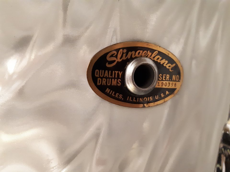 From what I can see, this kit has been re-wrapped in a more modern White Satin Flame. All three of the pictured badges are from different years and the grommets are not original. Pictures of the shell interiors will be more revealing. We need to know if these are 3-ply with rings or 5-ply without rings. Are the interiors clear maple or "chocolate milk"? However, my gut tells me that this kit may be from sometime in the 70's.