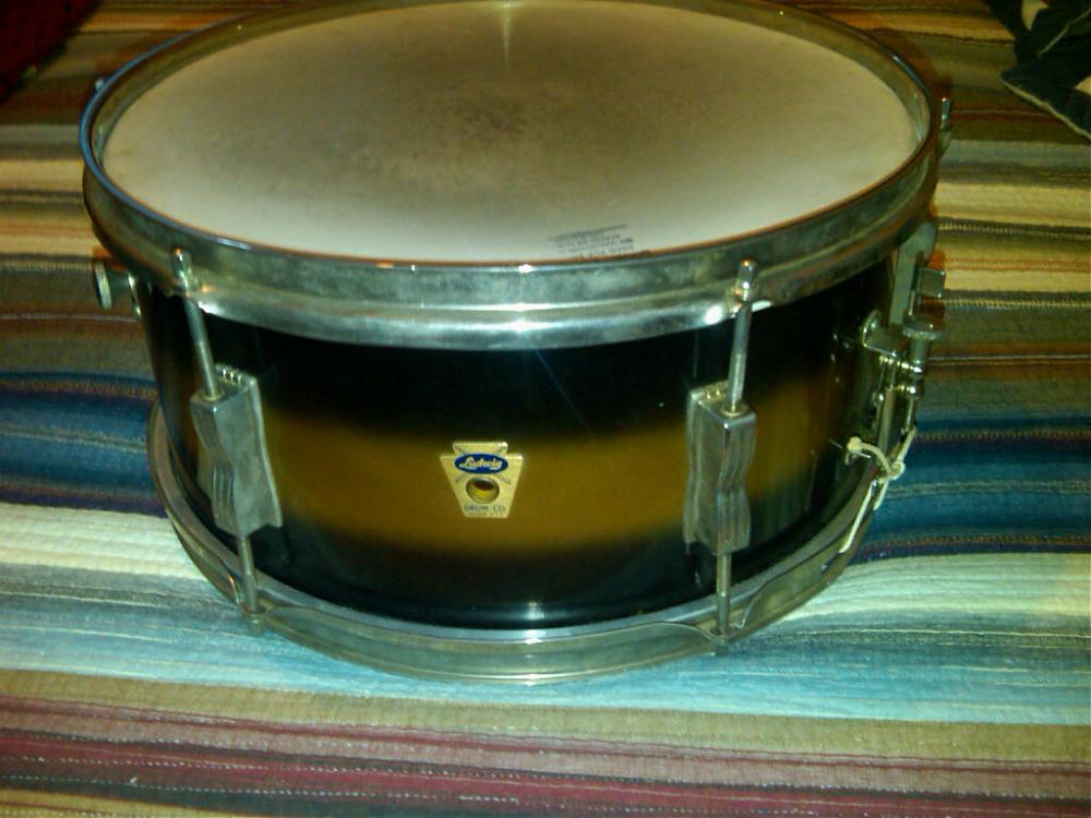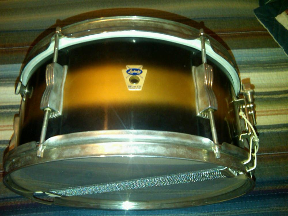 I was given this for a future "amount" or buddy favor from a friend who makes guitars for Fender. I'm assuming the person who owned it makes it more valuable then it is. This drum belonged to Freddie Tavares. I saw this drum about 6 months ago at my friends house and saw the trans badge and thought it was collectible, the duco finish is pretty flawless. All original except for the snares which are Rogers.