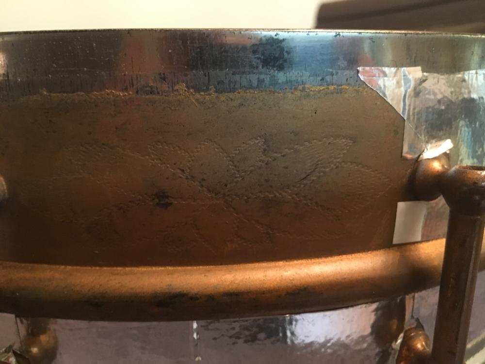 A couple of days ago I bought a snare drum wrapped in foil contact paper from an old timer. When I removed the contact paper I found gold paint over the shell of what looks to be a 1926-27 Ludwig Black Beauty, Standard Deluxe. Unfortunately there are two extra holes due to a muffler and the holes are directly over the Ludwig Chicago engraving. Any suggestions on removing the paint without causing any further damage?
