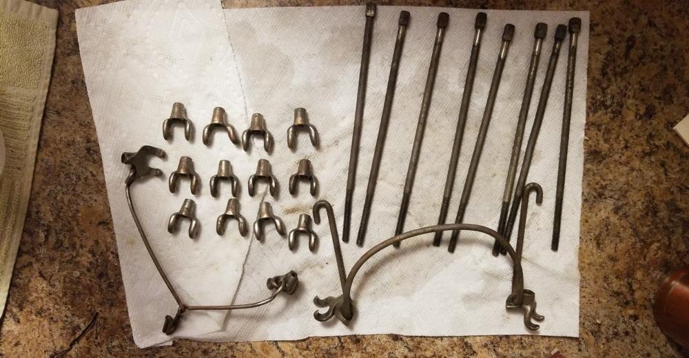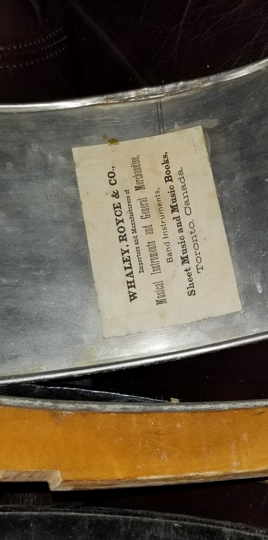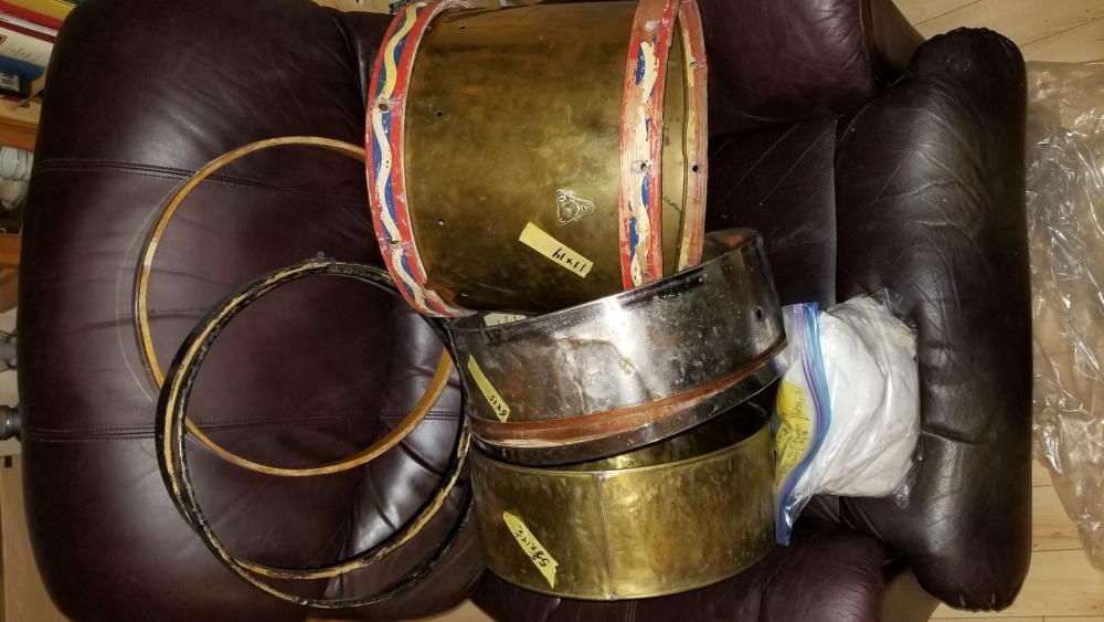 3 metal shells - two maybe 20's 30's - I don't know how old the heavy brass parade shell is. There are also 8 old t-rods and handmade claws that look to be the same as the ones that were on my 1925 Wilson Brother's snare I sold a few years ago. The small brass shell has no markings the parade shell was made in Quebec Canada and the other shell has a paper tag indicating it was imported to WHALEY, ROYCE & Co., Toronto, Canada