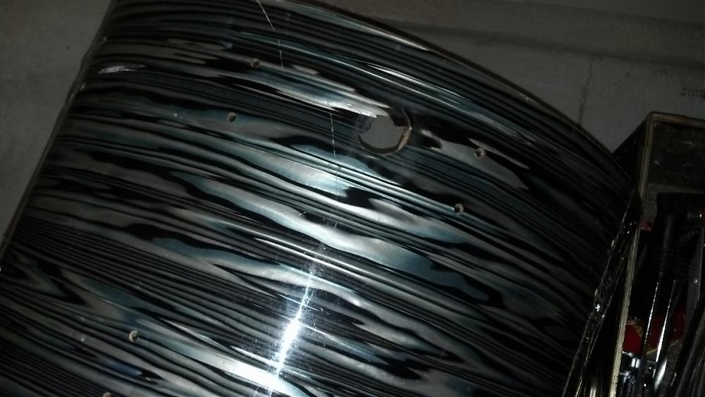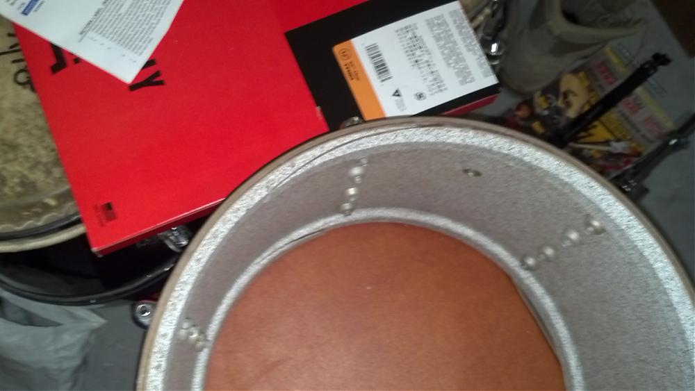 As mentioned in my "hello there" post, I recently got gifted a Ludwig Standard 13" tom and 22" kick that I'm pairing with a Ludwig classic floor tom to create a decent player's set. One of my first jobs, as I see it, is doing what needs to be done to fix shell issues. The edges are fine, the shells are round as they need to be. However, the tom's re-rings have begun to separate. (see attached phone photo)