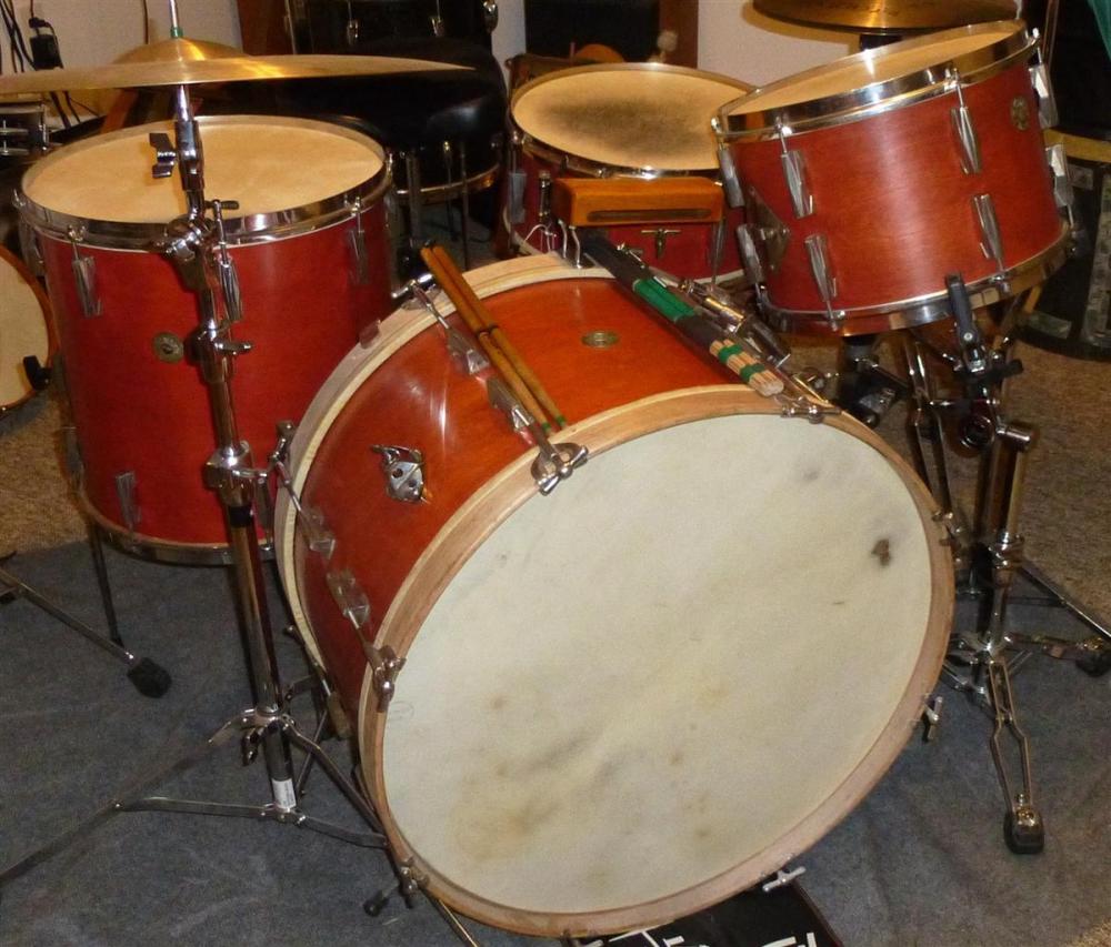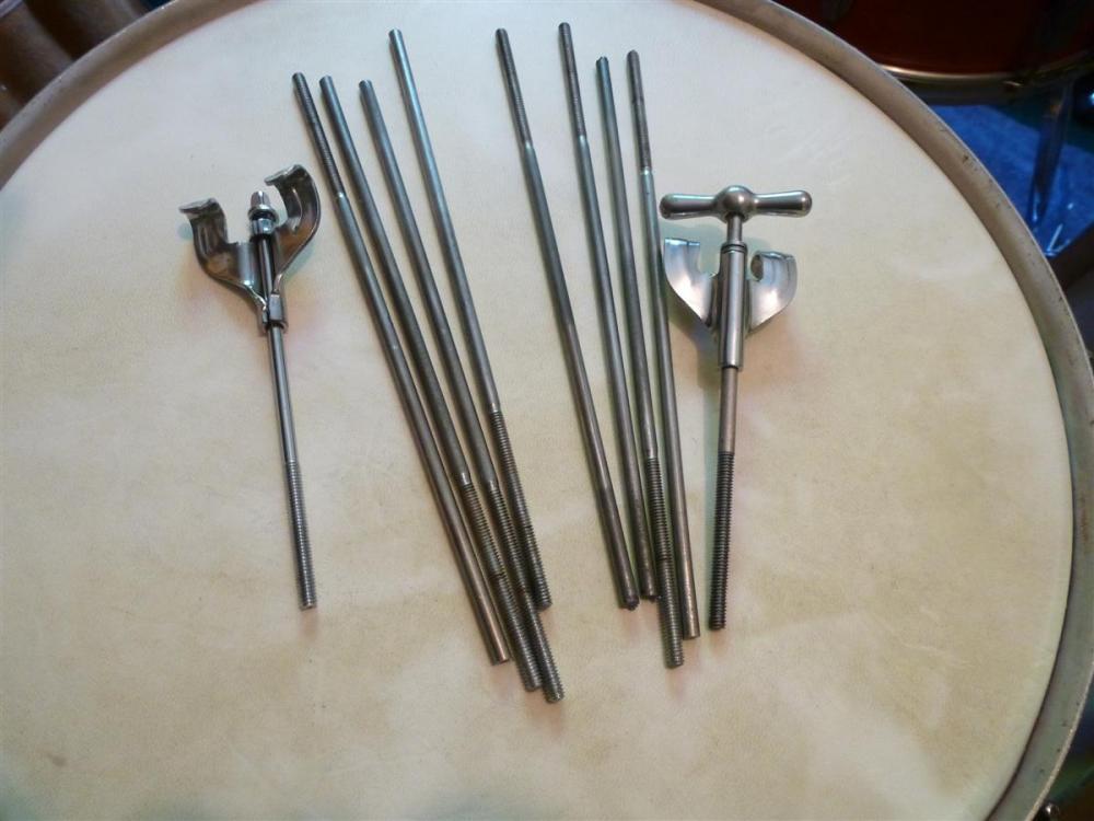 Most of the hardware is original to each drum. I did have to find a set of 8 t-rods and claws for one of the bass drum heads. These 1940's t-rods are just that much longer than any that I was able to find so I bought a set of single tention t-rods with the era correct claws and cut them down and threaded them. They did the job and the only way you would notice they're not original to the seperate tension bass drum is if you looked at the end of them and you'd see they're not factory rounded. I could file/round em off but why - they work.
