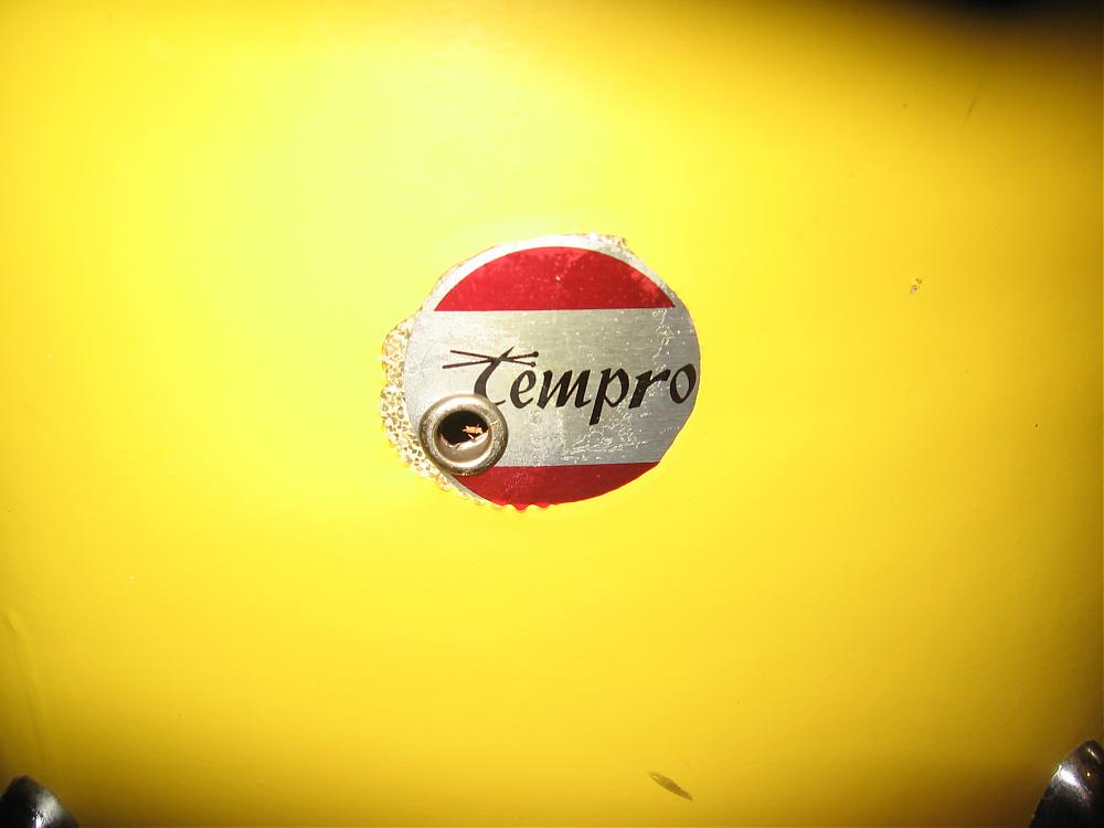 Once there, I saw a scrap of bright yellow paper in a pile of parts. "No way..." Sure enough, it was the same banana yellow contact wrap that my floor tom had been wrapped in! Furthermore, the badge on the bass drum matched the floor tom. Round, offset Tempro badge!