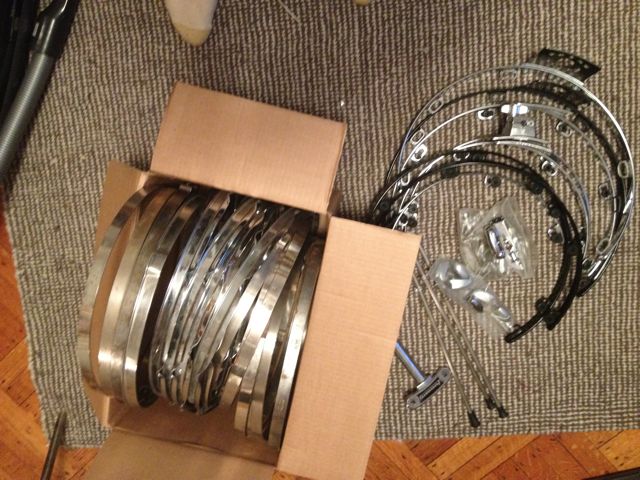 box of 14 and 15" snare hoops ...some triple flange, some single/no flange old hoops.