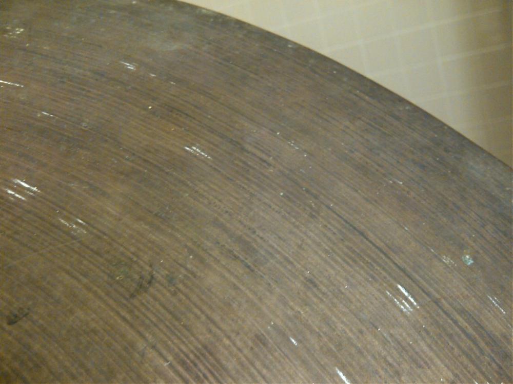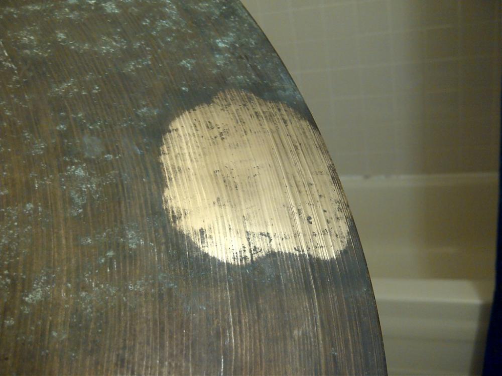 So far, only in the spot shown and also some on the bottom as a test, I have used ketchup to get the bulk of it off, then Zildjian's cream in the tube cleaner (white tube, black label) - yes, this is a pretty old tube of cleaner that I had for years before using recently ("Professional Cymbal Cleaning Cream").