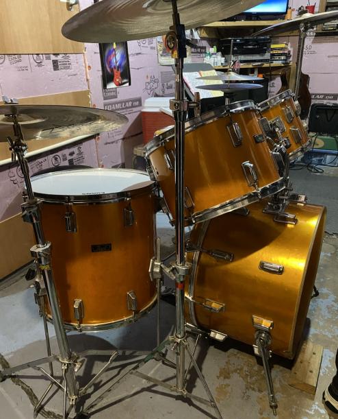 Gold Satin is the wrap color if I'm not mistaken. Based on the hardware '73-'77ish. I have a set in blue satin. Cool drums. Loud and heavy. How does that snare sound? Never seen one.