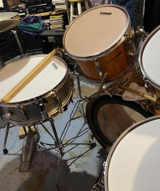 Cool orange Pearl fiberglass kit (12,13,16,22”) that the guitarist has at his place. Has a nice CB-700 snare too. He paid for some new heads that I’ve installed. It needs a bass drum reso head and proper muffling if needed yet.