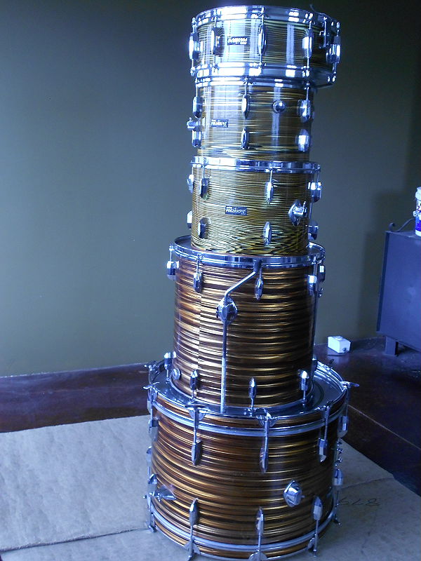 A Craigslist find. 12, 13, 16, 22, 14 snare. I'm damn broke but I ran across the state for these. They were advertised for $200. I didn't go for the shells, but it turns out they are phenolic and sound GREAT! I went for the set of Ludwig hardware that came with AND the cymbals. The hats are some scrappy little Paiste 13" 404S. Also included a 15ish crash (maybe a hat top, but pretty light) Zildjian and a 14" Paiste Rude. All of that would have been enough to make me happy for $200. However, there was also a white label 24" Paiste Giant Beat included. (Thanks for the offers, but it is not for sale!) Ooooooh that bell sounds godly. Yummy, yummy PIE!!!!